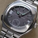 The rotor contrasts a dark, black-rhodiumed central section with a lighter platinum outer ring.