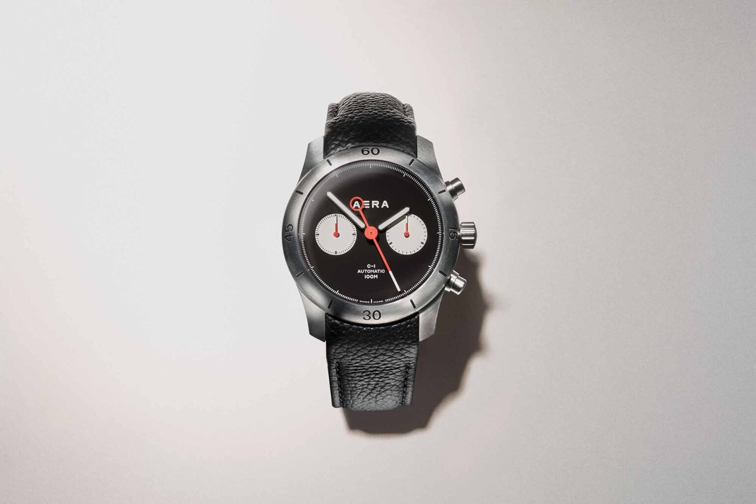 While not their first motorsport watch, the new C-1 Chrono takes aesthetic cues from the Porsche-inspired C-1 Rennsport and simplifies them down to a more legible, streamlined whole. The most striking element is, of course, the reverse-panda color scheme; a matte black dial, devoid of markings save for a very, very fine minute track around the outer diameter, allows the two matte white chronograph subdials at 6 and 9 o’clock to pop aggressively. The red hour, minute, and chronograph hands, and red and white seconds hand add that touch of automotive flair, bringing the aesthetic straight into the cockpit of a golden era sports car. The sans-serif Aera logo wears Globolight to glow white in low-light conditions, while the hands are coated in Grade X1 Swiss Super-Luminova.