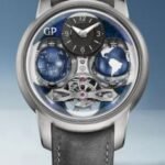 In this model, the central axis bearing the minutes hand is complemented by the hour counter at 10 o’clock and the seconds counter at 6 o’clock.