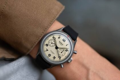 Titanium, used for the case and integrated bracelet with its three-blade folding clasp, ensures lightness on the wrist, while the bezel, caseback and bracelet studs are crafted in BMG (Bulk Metallic Glass).
