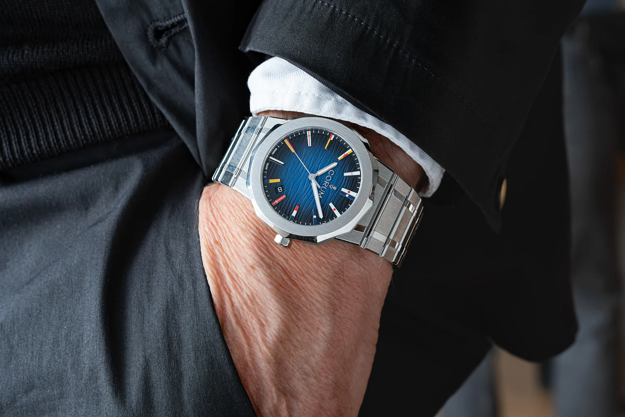 The number of SKUs will drop from about 250 previously to just 21 this year, according to the CEO. There will be 11 new Admiral models in two sizes, five in 36 millimeters and six in 39 millimeters, using case materials from steel to titanium and gold. The Admiral watches will start at about CHF 10,000 up to about CHF 33,000.