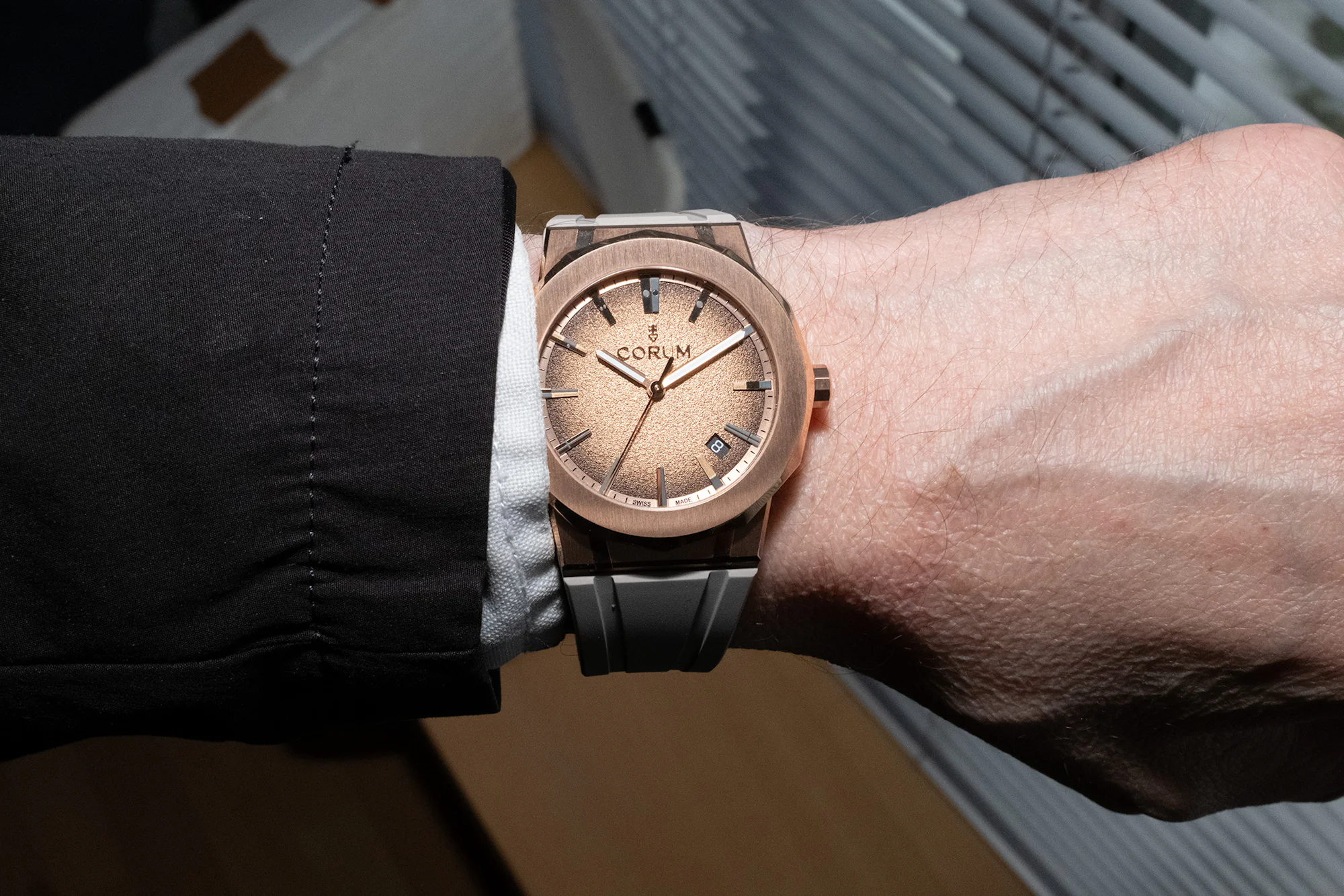 The new Corum Admiral in 39 mm with a 5N 18k gold case and rubber strap is priced at CHF 33,000.