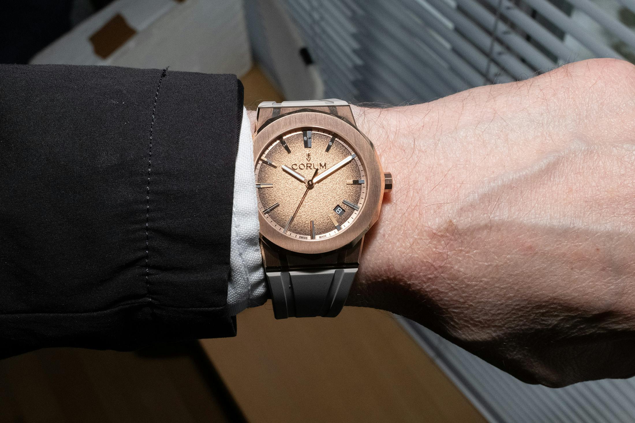 The new Corum Admiral in 39 mm with a 5N 18k gold case and rubber strap is priced at CHF 33,000.