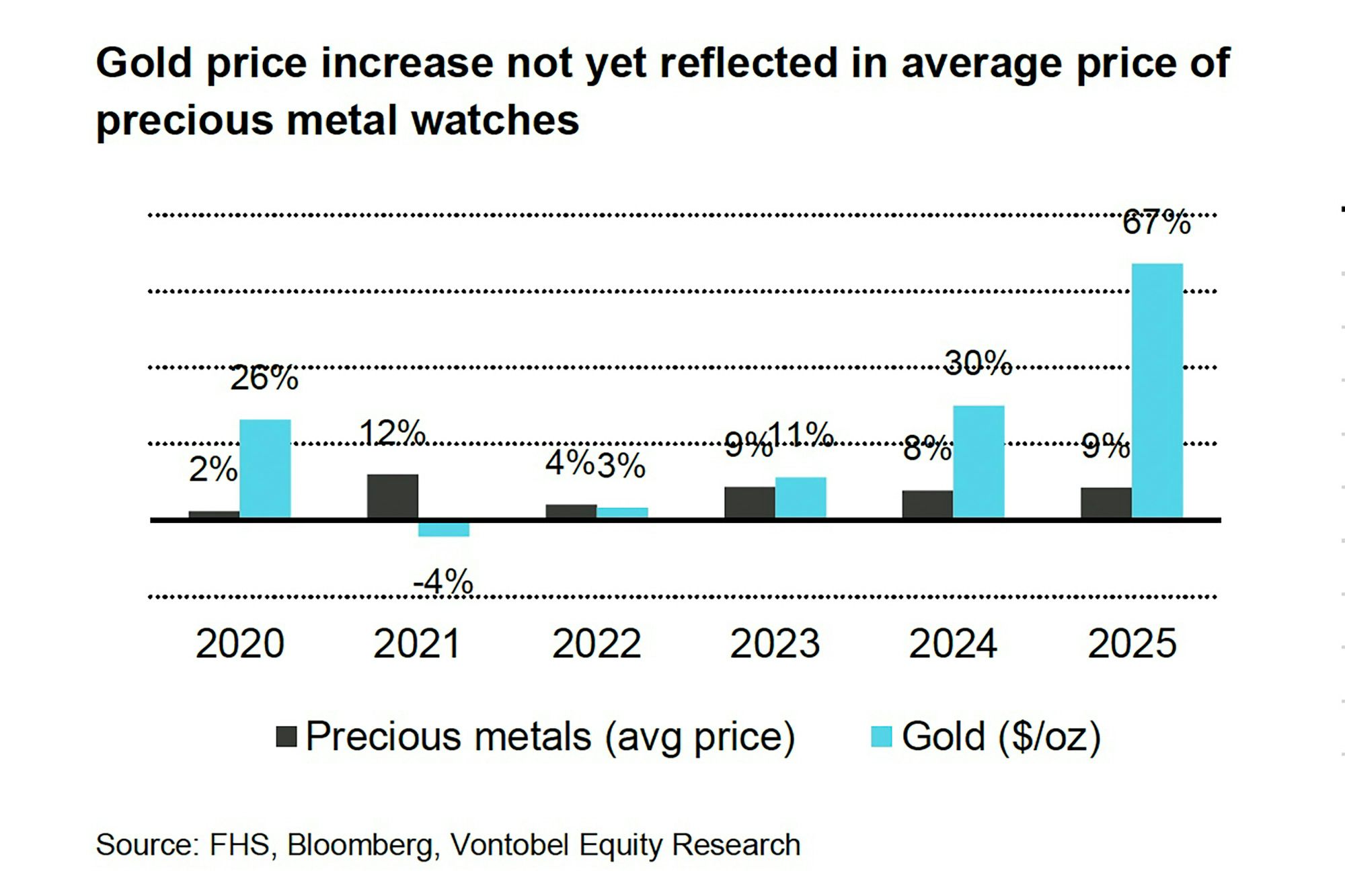 The report further highlights the rapid rise in gold prices and shows that watch industry price increases, while a hot topic in consumers’ minds and watch buying considerations, have failed to keep pace with the torrid gains in gold prices, which soared about 67% last year to record levels. As gold prices surged, the average price of precious-metal watches rose just 9% in 2025 and 8% the year before.