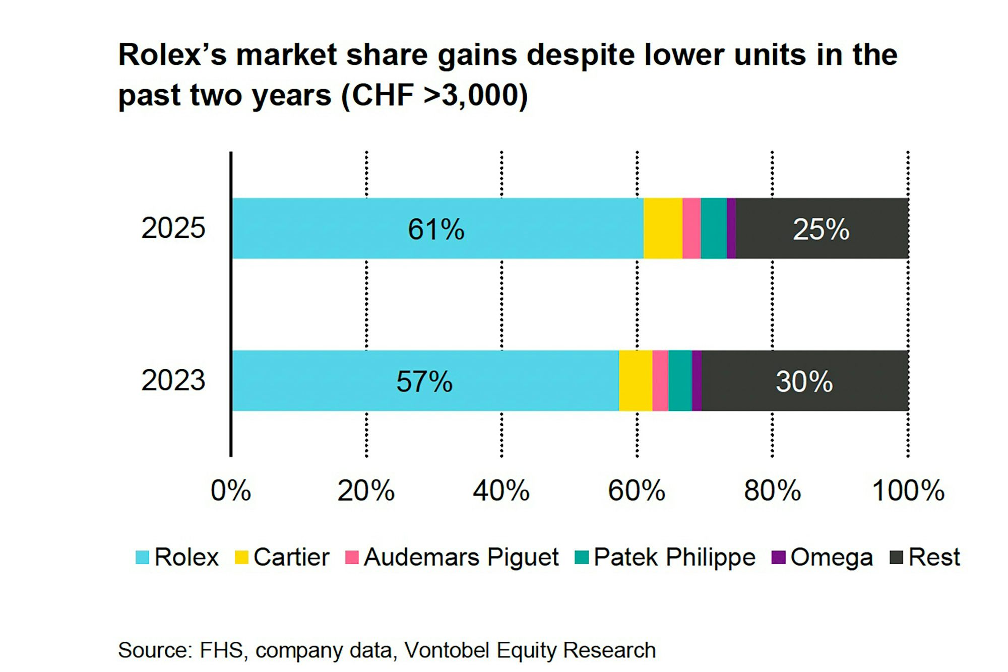 Rolex, the top Swiss watch brand by sales, reduced its production in 2025 for the second year in a row while increasing its dominant market share position as the industry continued to make pricier watches at lower volumes, according to Swiss bank Vontobel.