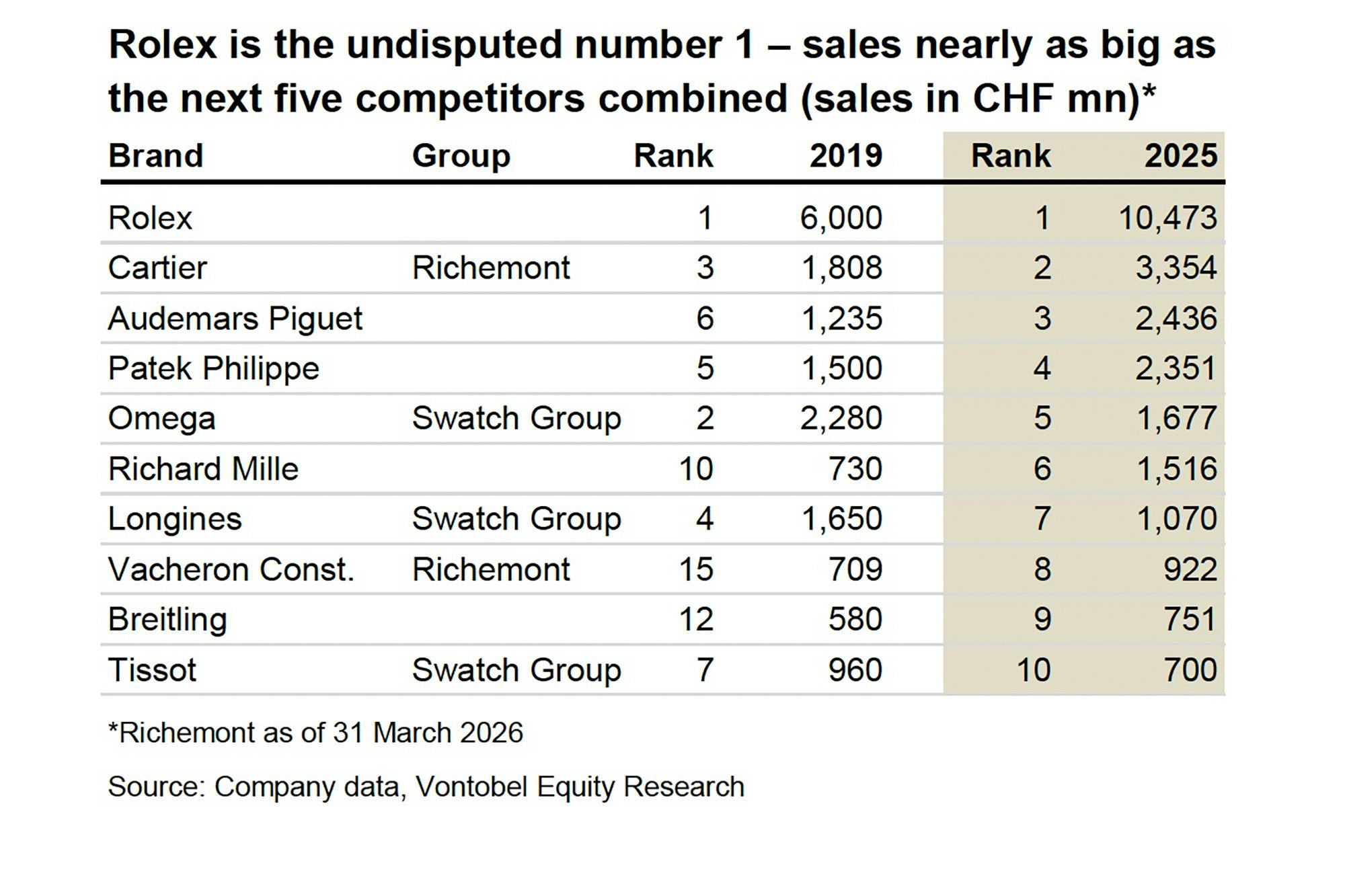 The report ranks the top 10 brands by sales, showing that Rolex, with close to CHF 10.5 billion in sales, has grown to be larger than the next five competitors combined. Cartier watches, meanwhile, have climbed to the number two spot from third in 2019 with annual sales in 2025 of about CHF 3.4 billion. Audemars Piguet, thanks in part to its vertically integrated retail model, in which the brand sells the majority of its pieces in its own boutiques, is now in third with about CHF 2.4 billion in sales, up from the sixth-largest in 2019.