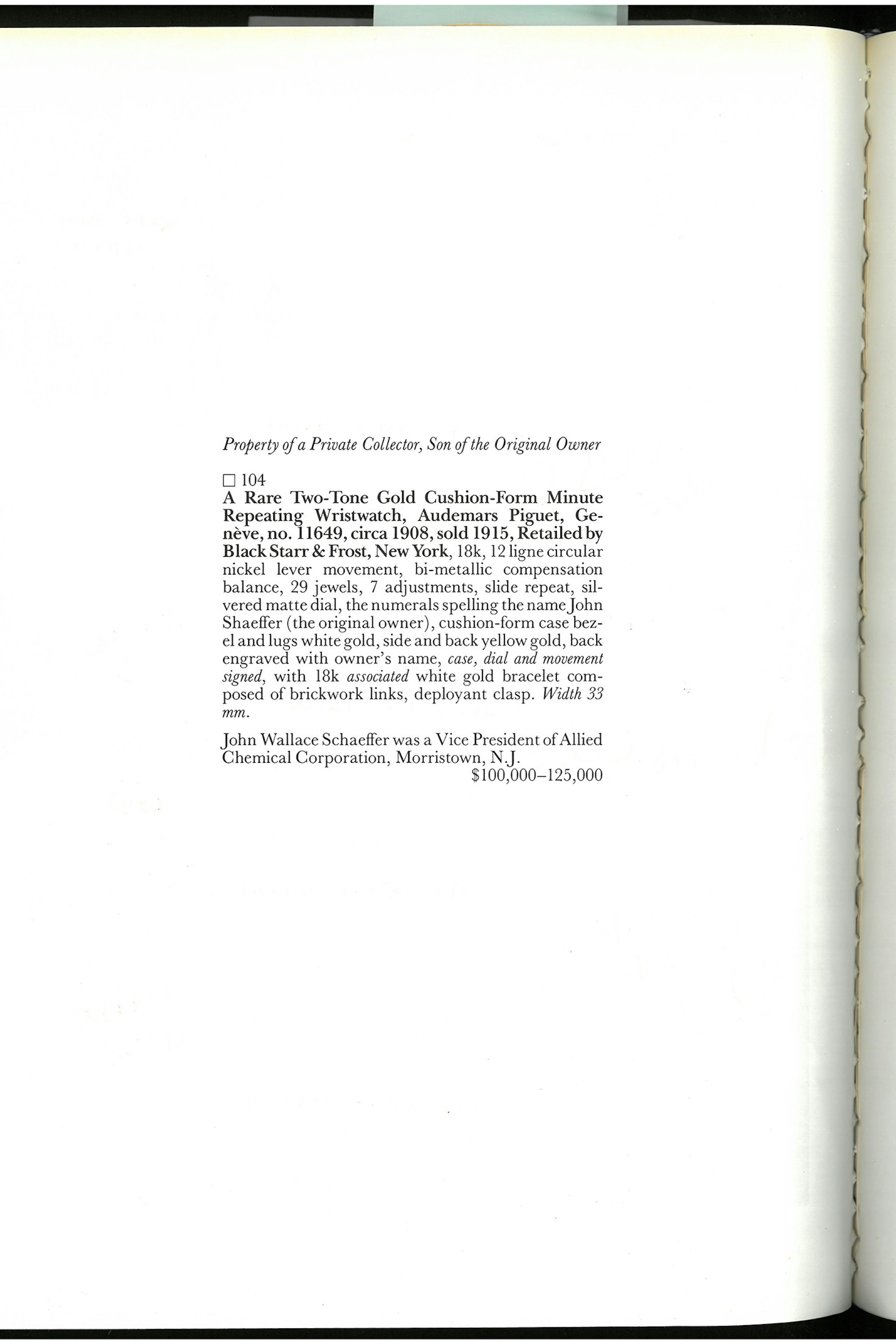 Then came the design of the John Shaeffer itself. In 1989, Audemars Piguet found inspiration for its next watch. That year, Sotheby’s offered a watch at their October New York auction labeled the following: “A Rare Two-Tone Gold Cushion-Form Minute Repeating Wristwatch, Audemars Piguet, Genève, no. 11643, Circa 1908, Sold 1915, Retailed by Black, Starr, and Frost, New York.” The watch featured a nine-line beads of rice bracelet with the clasp engraved with John Wallace Shaeffer’s monogram. The catalog even misspelled Shaeffer’s name in one reference. The watch was consigned by Shaeffer’s son, with an estimated value of $100,000 to $125,000. AP purchased the watch for $220,000, including buyer’s premium.