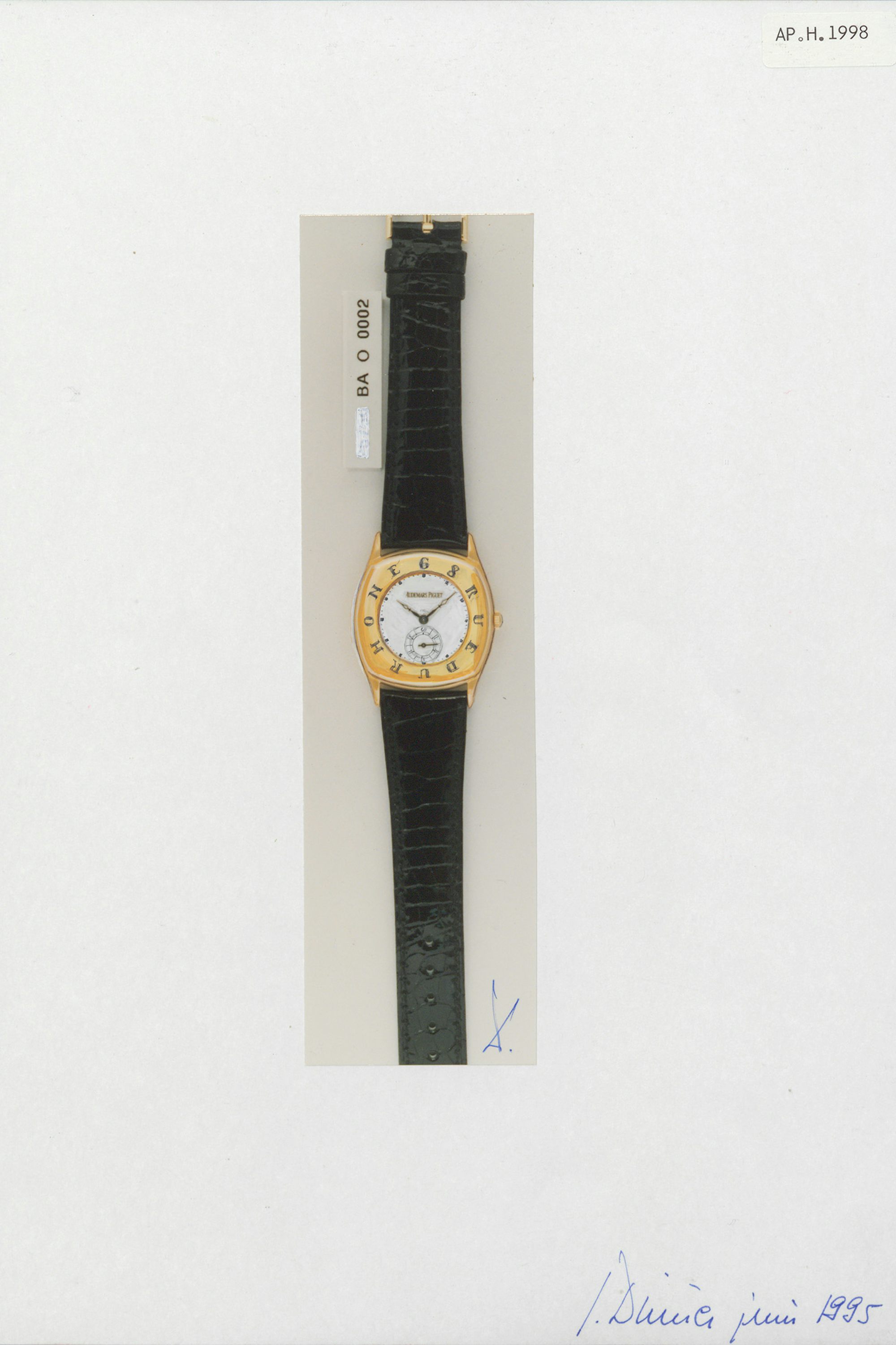12″‘SMV movement no. 6, 18k, caliber L.E. Piguet. Matte 14k gold. Enameled Breguet hours. Black, nameless [no signature]. Wide, soft stripes. Blue Breguet hands. Pointed lens. Pendant without collar (?). Ann Paris special (?) case, 32mm by 29.5mm, 18k yellow gold without cuvette, American hinge. Inlaid-style movement, caseband clear of its entire width. Movement & 12″‘ dial