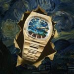 Machined from steel, the Cut‘s case has a cushion-shaped curve, with the sides cut to create angles and bevels. It measures 36mm in diameter, features a crown at 1:30, and is topped with a satin-finished bezel or one set with 56 diamonds, depending on the version chosen.