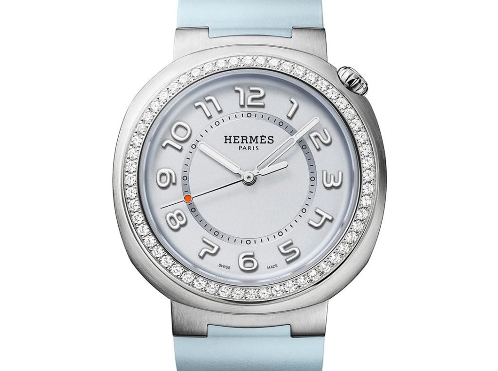 Matching the interchangeable rubber strap, the dial’s color borrows the shades of a slightly cloudy sky, a pale blue highlighted by an opaline finish. Applied, coated with gray PVD and white Super-LumiNova®, the Arabic numerals are indicated by the tips of two hands and a seconds hand finished with an orange dot. In the center, the minute track extends along an azure ring. The hours, minutes, and seconds are powered by a self-winding movement, the H1912 caliber. Vibrating at the standard frequency of 4Hz, this Hermès-designed motor provides a power reserve of approximately 50 hours when fully wound.