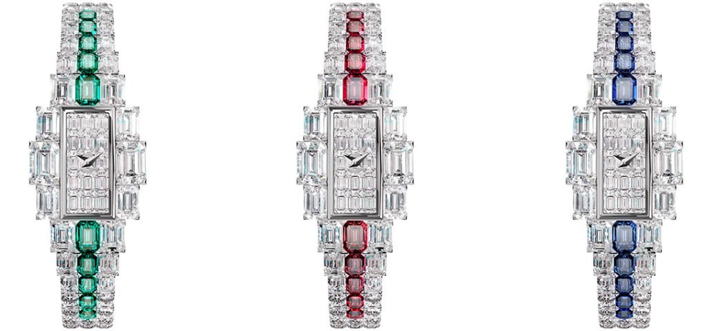 The realm of decorative arts is celebrating its centenary this year and this artistic movement continues to inspire contemporary creations. Vacheron Constantin‘s Grand Lady Kalla jewelry watches illustrate this majestically. Their geometric rigor and their sensuous look merges with the sparkle of astutely-set precious gems. The three variations share the same white gold case (19.4 x 30.1 x 8.3 mm), entirely adorned with ten emerald-cut diamonds and, based on the model, with two rubies, sapphires, or emeralds. Its dial glitters with 14 diamonds. “The deliberately-discreet cases serve as a backdrop for setting the stones, which shine in all their glory. The Kalla line is totally in keeping with this celebration of the diamond”, emphasizes Sandrine Donguy, Product and Innovation Director.