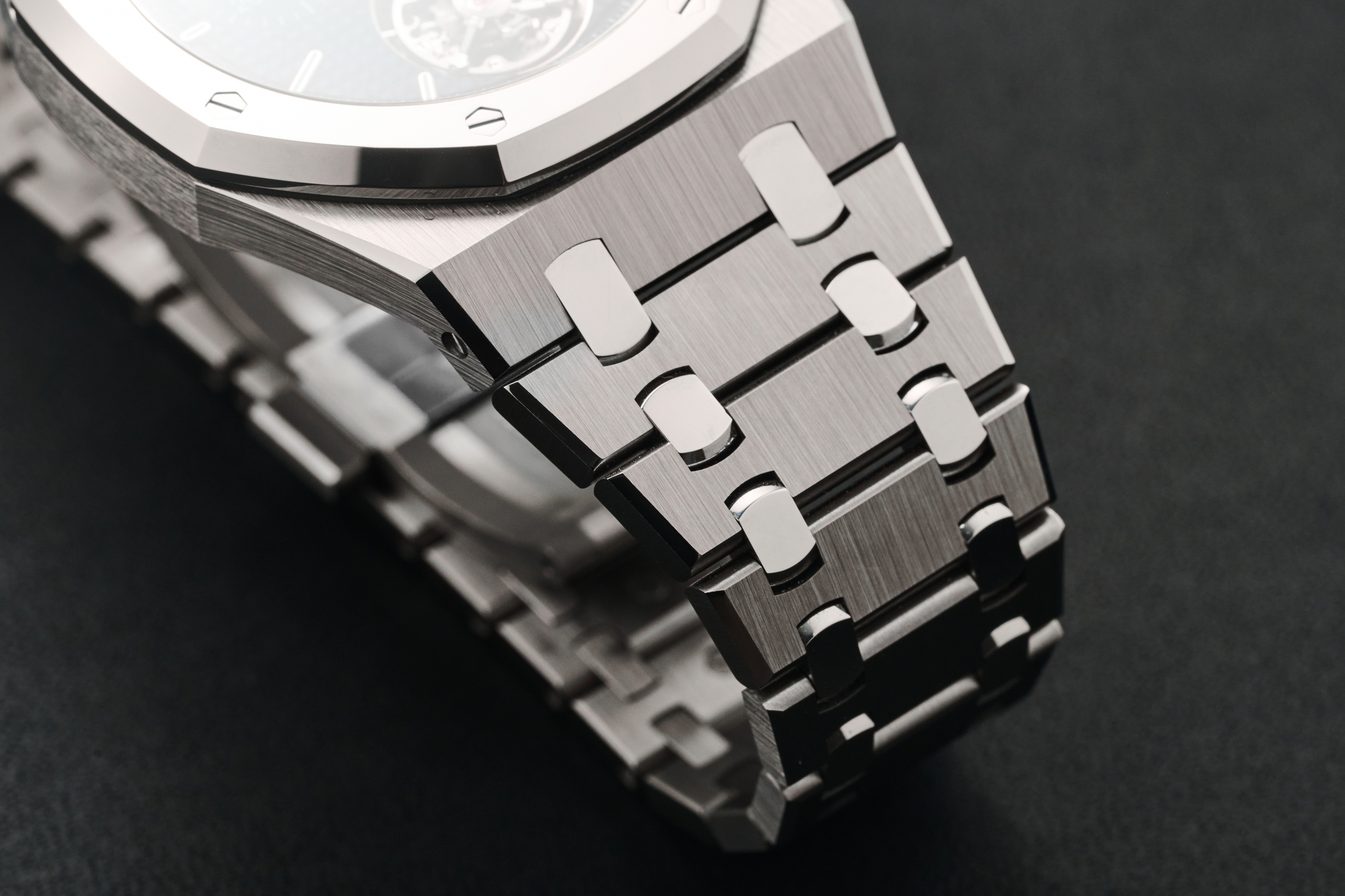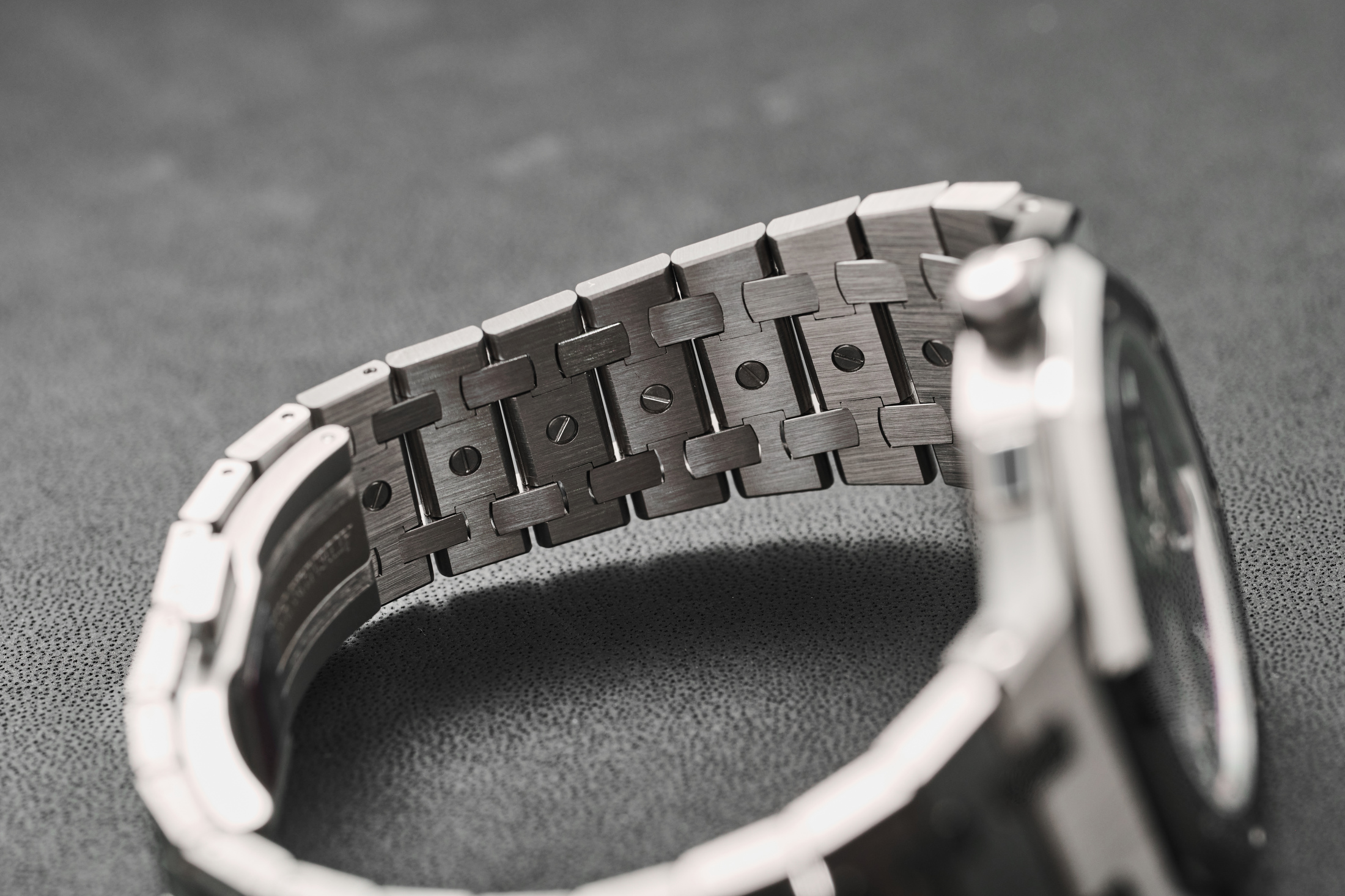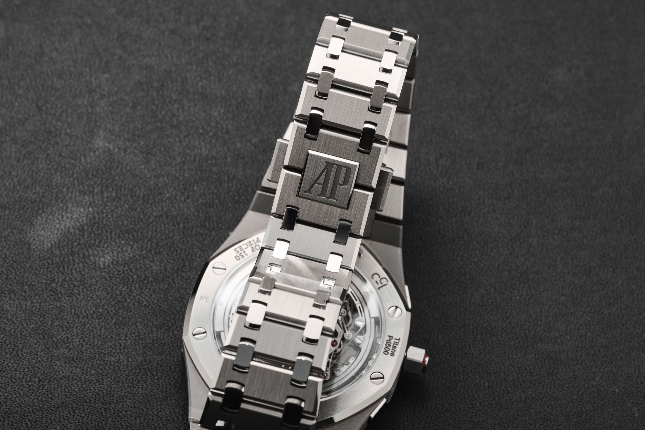 The case finishing is great, with the vertically brushed titanium and high-polished chamfers holding texture and color exactly as well as (and nearly indistinguishable from) a Royal Oak in steel. The bezel, intermediary links, and caseback are in palladium 500 bulk metallic glass. When you cool metal quickly enough, you get a non-crystalline amorphous internal structure that is actually, by definition, a glass – a glass with incredible hardness and shine. That’s great for the normally scratch-prone bezel, but it’s not scratch-proof. It’s also incredibly shiny—far more so than any steel or gold Royal Oak —and, more often than not, turns into a black ring reflecting a shadowy room. It’s strangely distracting and not my favorite effect, but I have to admit that, as a material, it’s probably preferable.