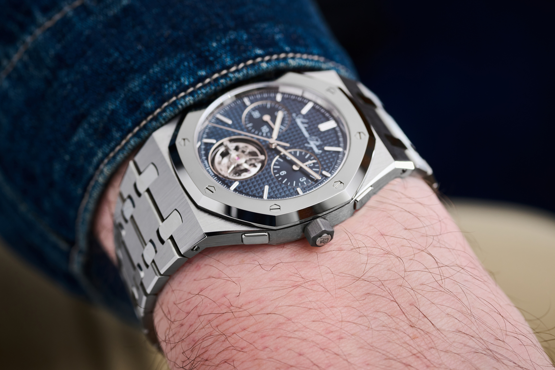 The flying tourbillon cage is much more at home on the 26545XT, partly because Audemars Piguet has been making tourbillon Royal Oaks for over 25 years (the first was the 25th-anniversary 25831ST). More recently, the melding of a flying tourbillon with the Jumbo case and a traditional blue dial in the 26670ST (for the brand’s 50th anniversary) set the stage well enough that I feel comfortable with the idea of an RO tourbillon.