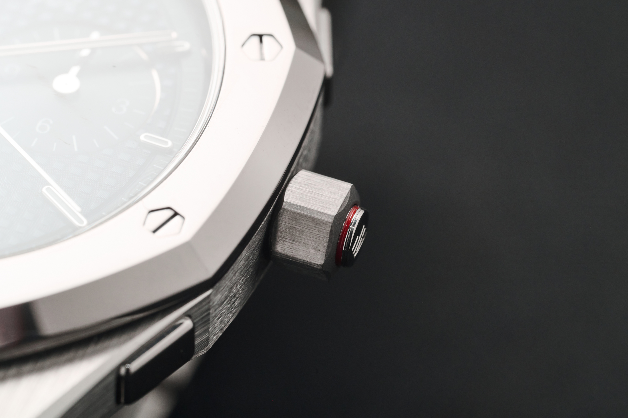 The case profile almost looks thinner than 8.1mm, maybe emphasized by the interesting, rounded rectangular pushers. They’re so unobtrusive that when John Mayer “leaked” or “teased” the watch with his “prototype car wrap” laser-etched model (if you know, you know), no one noticed he was wearing a chronograph. While the pushers barely stick out from the case enough to be seen, they’ve got enough travel to feel satisfying when activated. The crown features its own pusher that changes the crown’s function from winding (in) and setting (out), with a red ring displayed around the button.