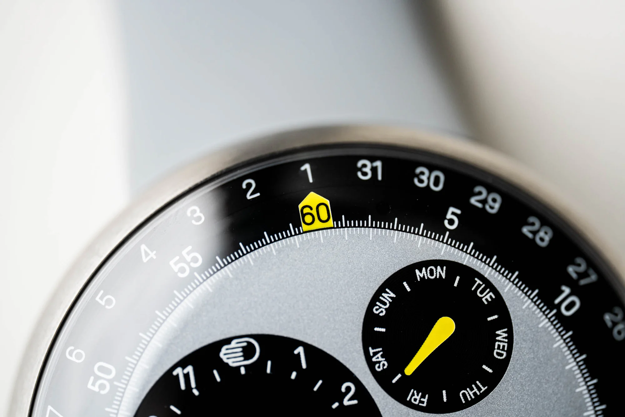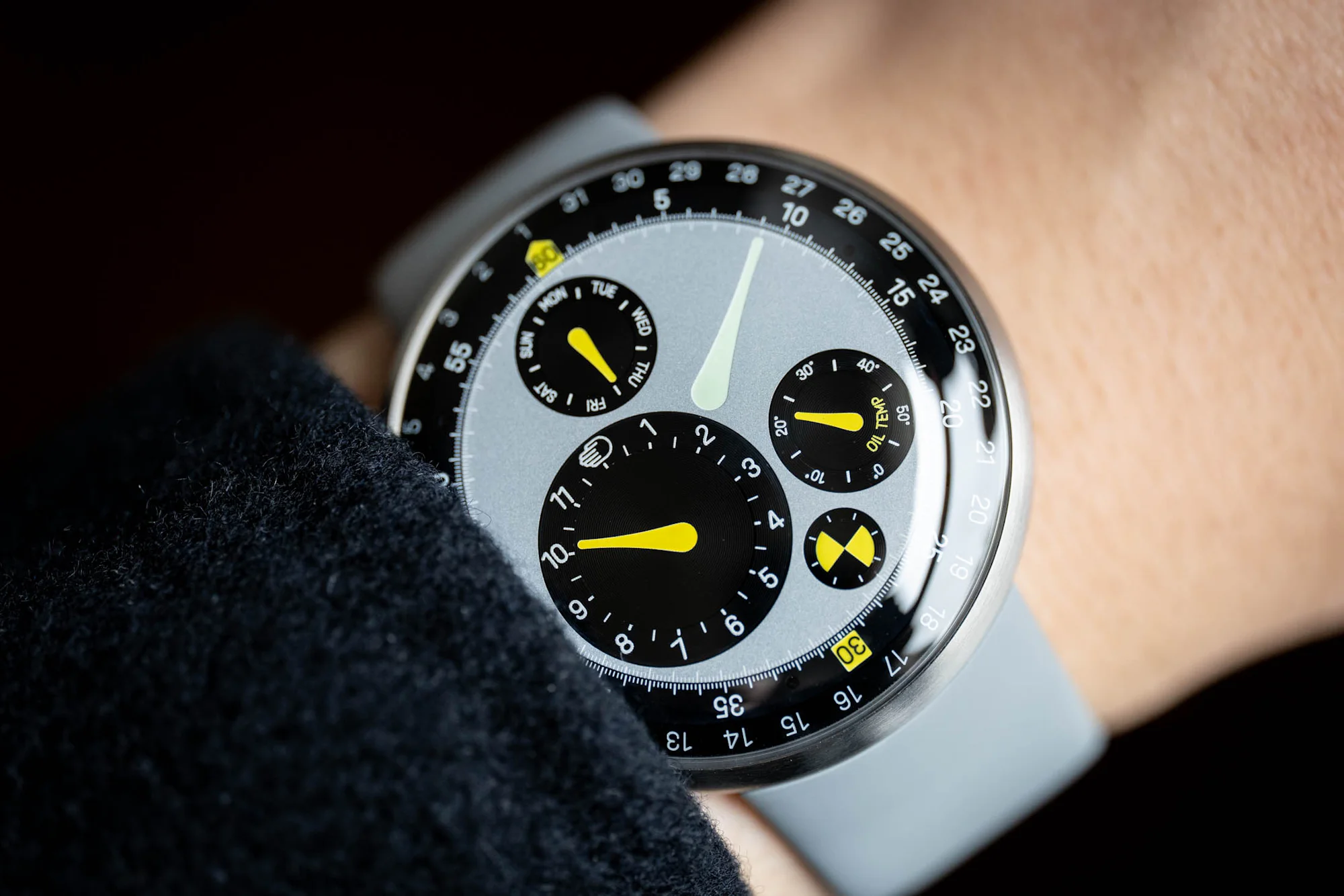 Thanks to the oil-filled effect, the black components of the dial take on a deep, inky look, contrasting with the matte-grained texture of the center grey disc. But up close, I was surprised to find pronounced snailing around the black satellite discs, completely missed at a normal distance. It’s a nice touch that adds an extra mix of textures to a completely flat (or rather, convex) dial. Surrounding the minutes track is the date ring, with the current date indicated at 12 o’clock by the yellow-accented 60-minute marker.