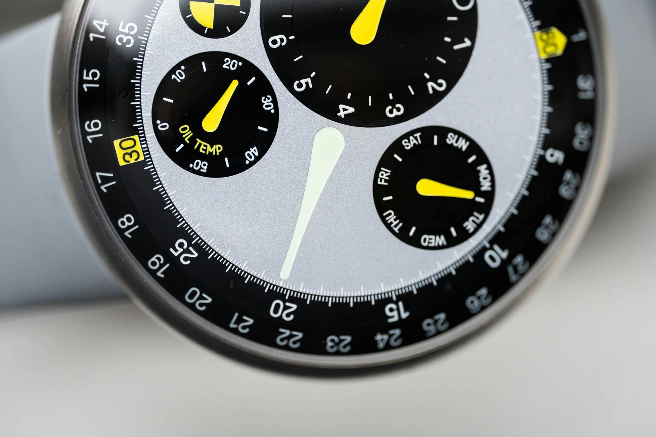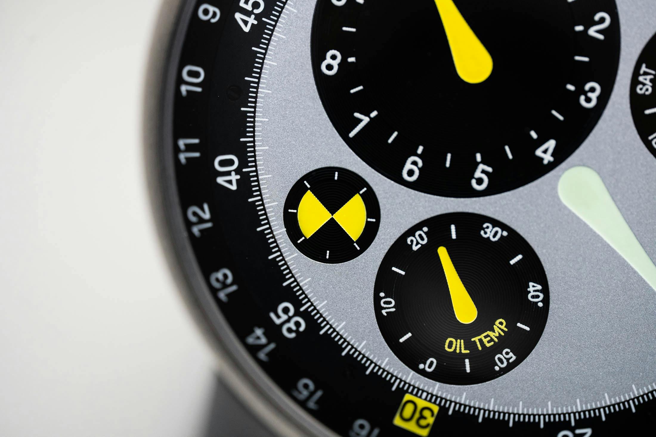 Thanks to the oil-filled effect, the black components of the dial take on a deep, inky look, contrasting with the matte-grained texture of the center grey disc. But up close, I was surprised to find pronounced snailing around the black satellite discs, completely missed at a normal distance. It’s a nice touch that adds an extra mix of textures to a completely flat (or rather, convex) dial. Surrounding the minutes track is the date ring, with the current date indicated at 12 o’clock by the yellow-accented 60-minute marker.
