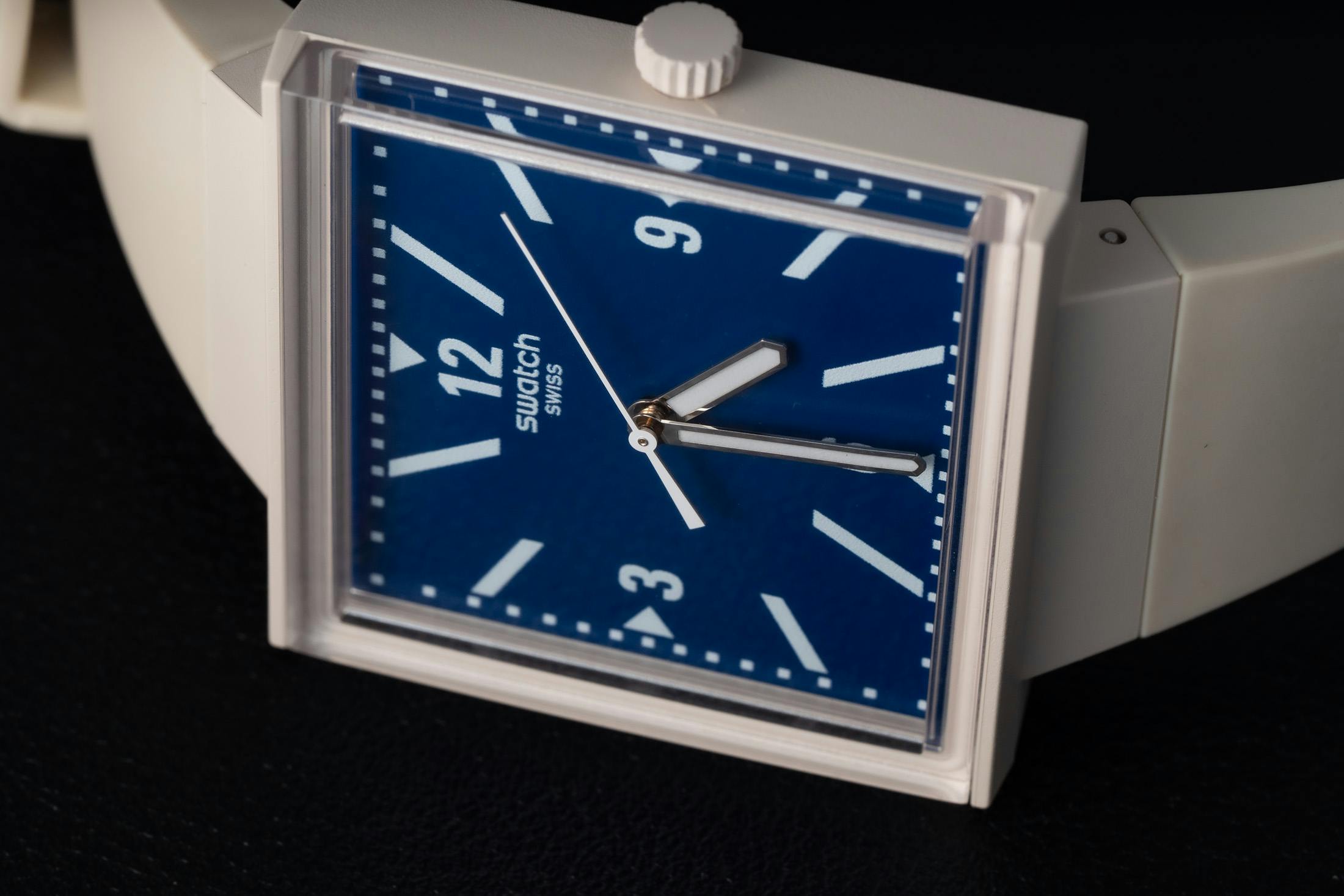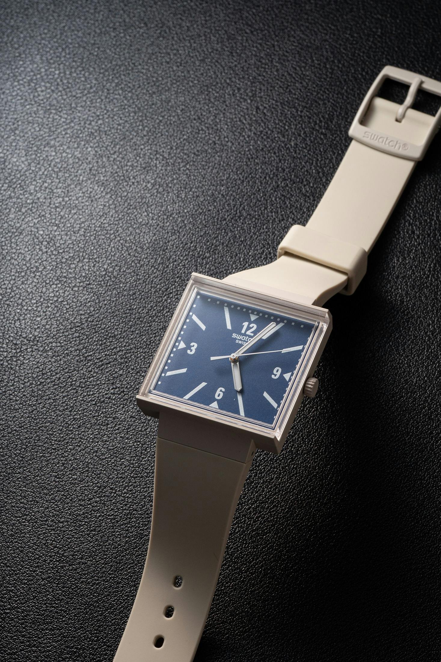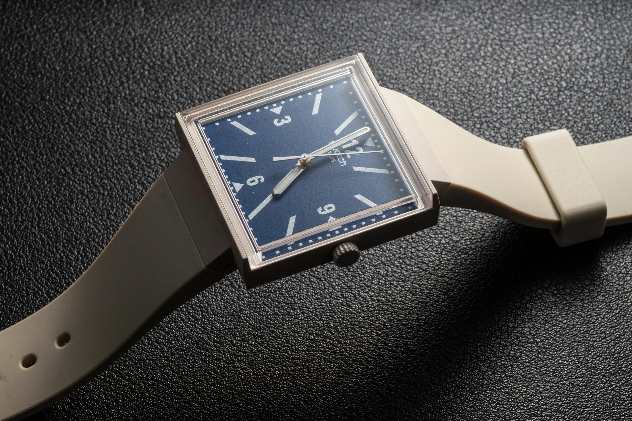 The case is the same 33mm × 33mm square we know from the original What If? model, crafted from the same bioceramic material used for the ubiquitous MoonSwatch. Swatch describes the case and strap color as “beige,” though in person, it’s a pale shade that is almost white. The integrated strap is lightweight and tapers toward the buckle, giving the watch a retro, 1980s look reminiscent of Swatch’s early days.