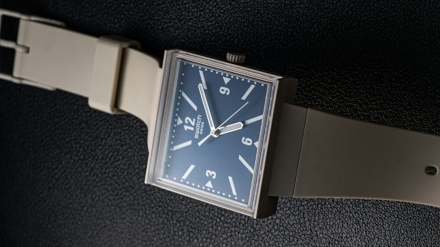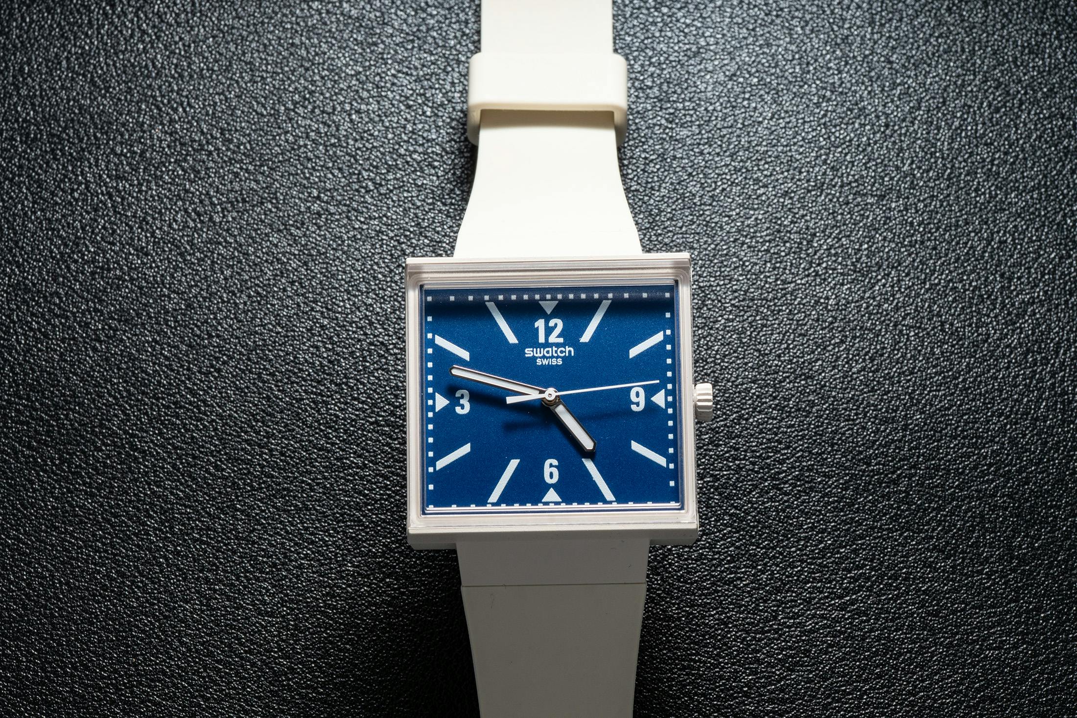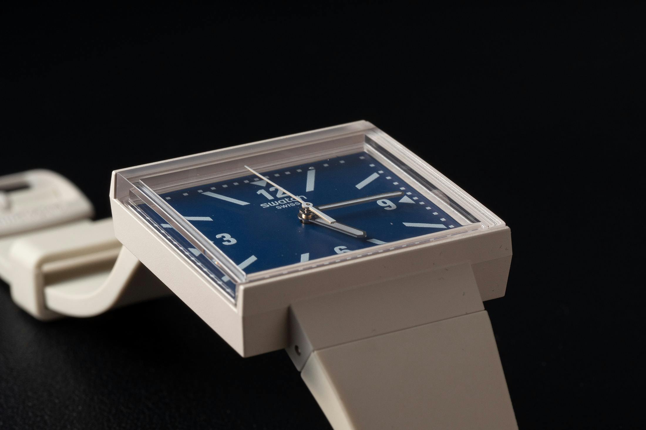 The case is the same 33mm × 33mm square we know from the original What If? model, crafted from the same bioceramic material used for the ubiquitous MoonSwatch. Swatch describes the case and strap color as “beige,” though in person, it’s a pale shade that is almost white. The integrated strap is lightweight and tapers toward the buckle, giving the watch a retro, 1980s look reminiscent of Swatch’s early days.