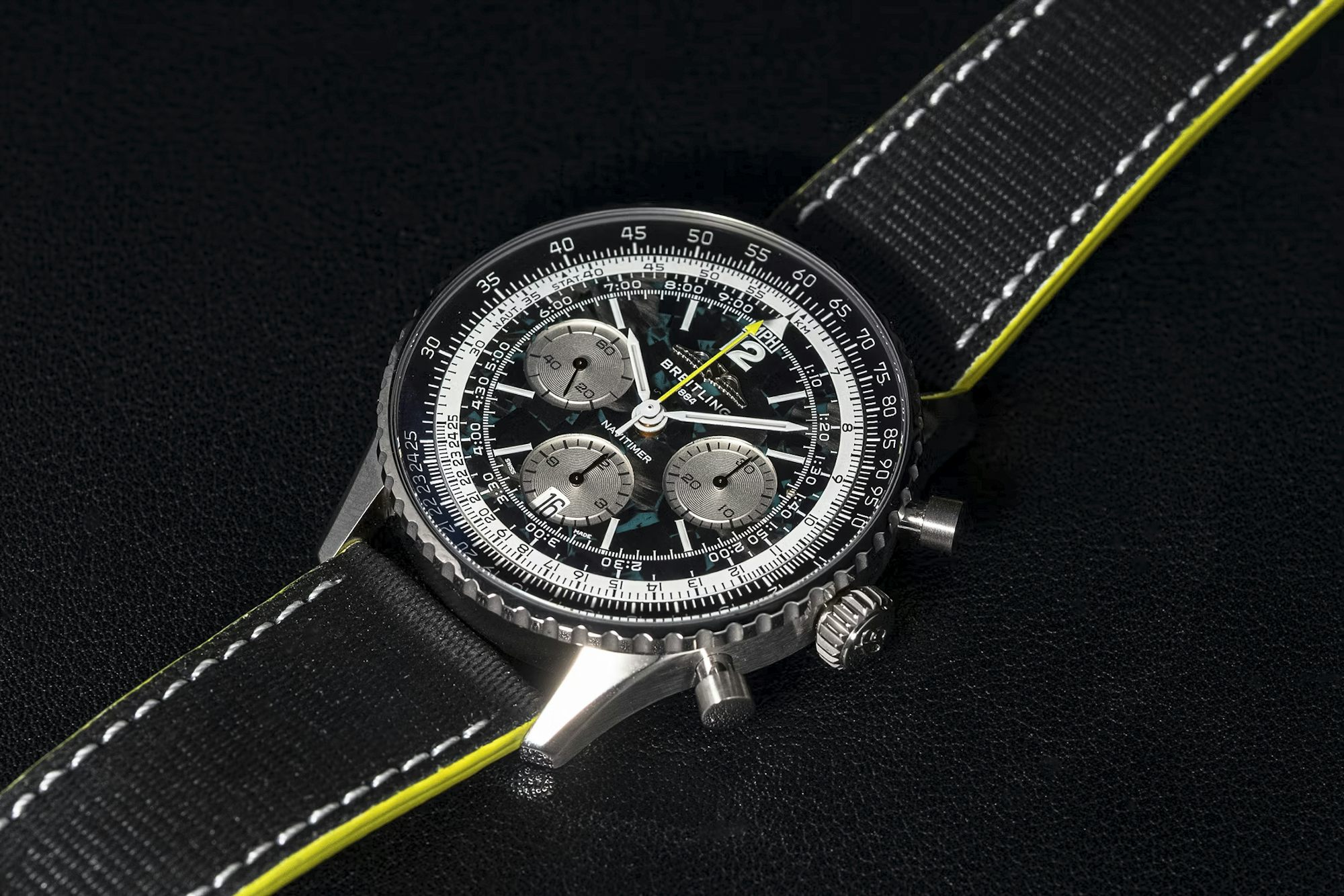 As for what ramps up the Aston Martin of it all, that’s (mostly) relegated to the caseback, with some more subtle features on thedial side. Under the cambered sapphire glass is a black carbon dial flecked with Aston Martin racing green. For good measure, the chronograph counter seconds hand is hard to miss, with a neon-greenish/yellow tinge that matches the F1 team’s accent colors. The same neon shade is used for the stitching of the embossed leather strap. This certainly isn’t the traditional strap one thinks of when conjuring a classic Navitimer in the mind’s eye.