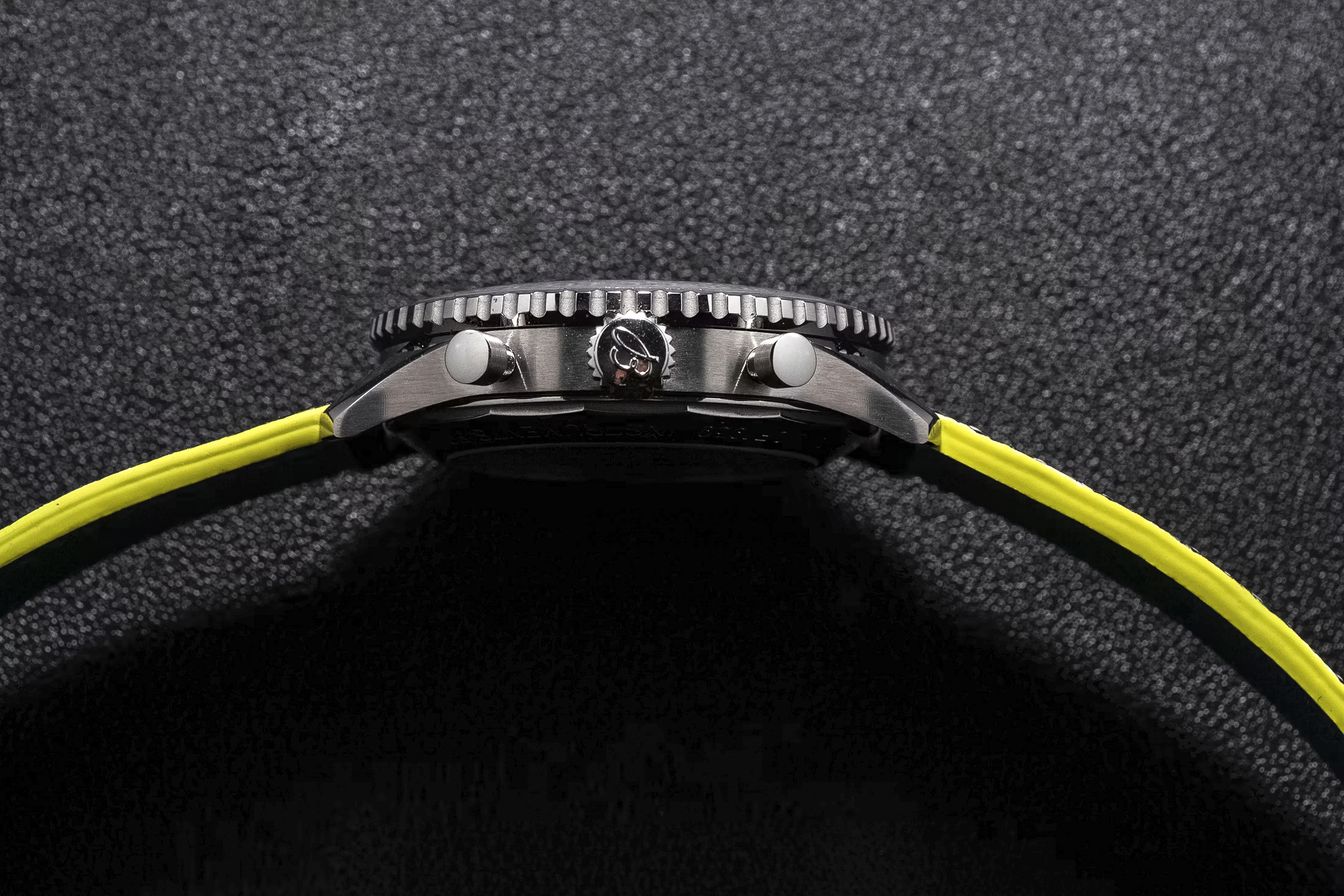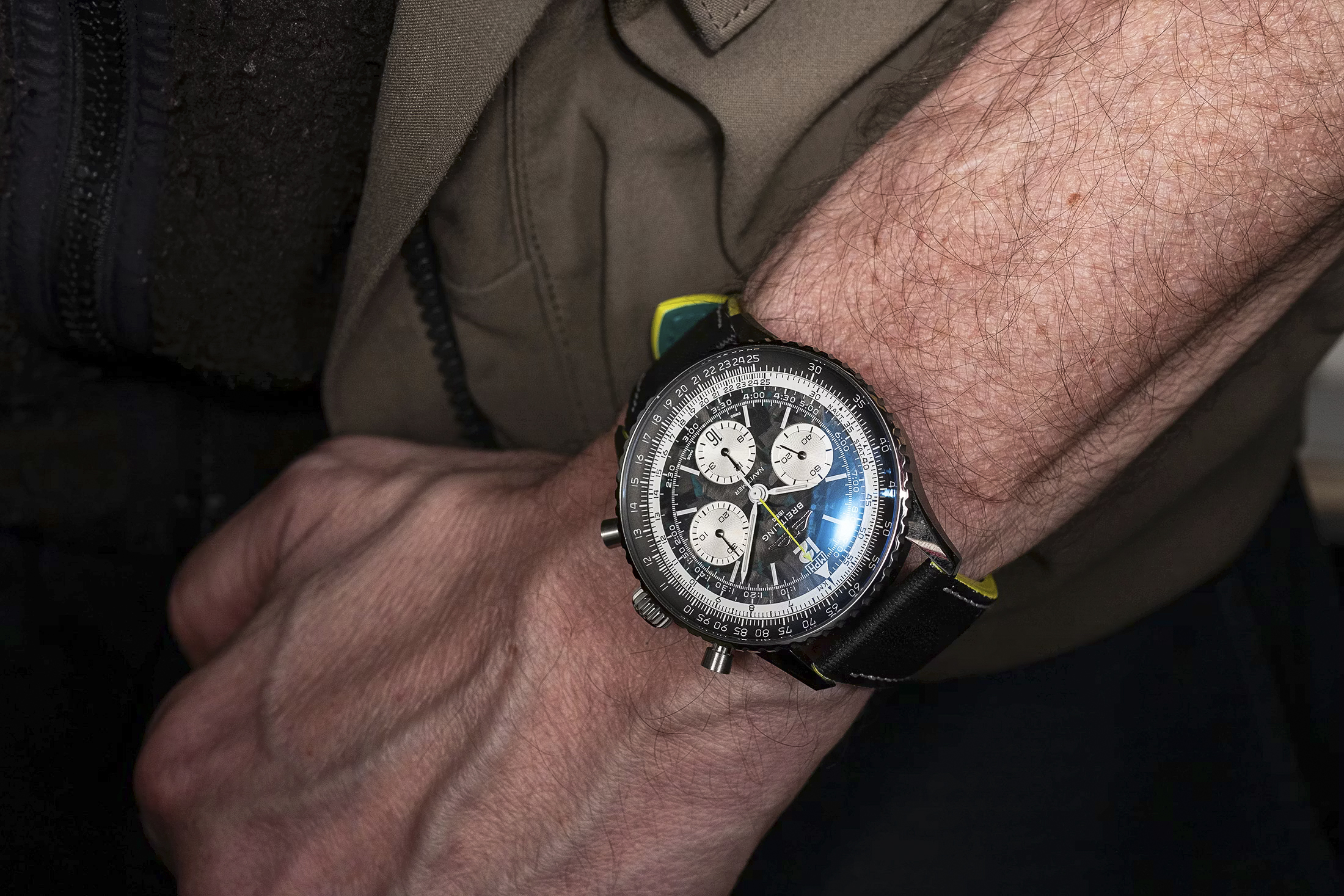The Aston Martin Navitimer downplays its flight-instrument attributes to highlight its abilities both trackside and behind the wheel. It’s surprisingly light in the hand and on the wrist thanks to the use of a titanium case. While it keeps the Navi’s traditional proportions with a 43 millimeter diameter, its lack of heft and very reasonable lug-to-lug of 49 millimeters makes this somewhat big watch a potential wear for those of us, like me, with a wrist size less than 7 inches.