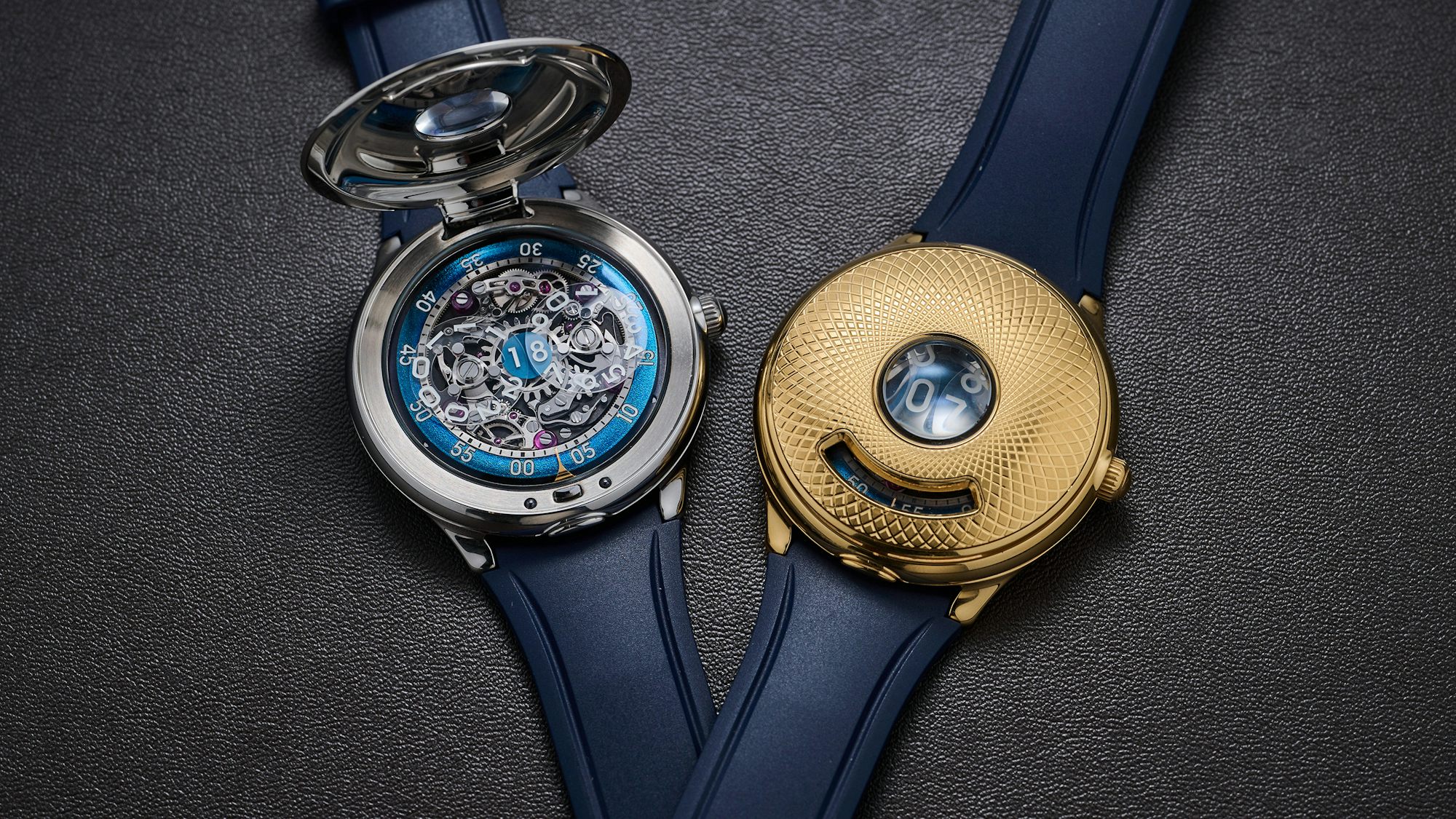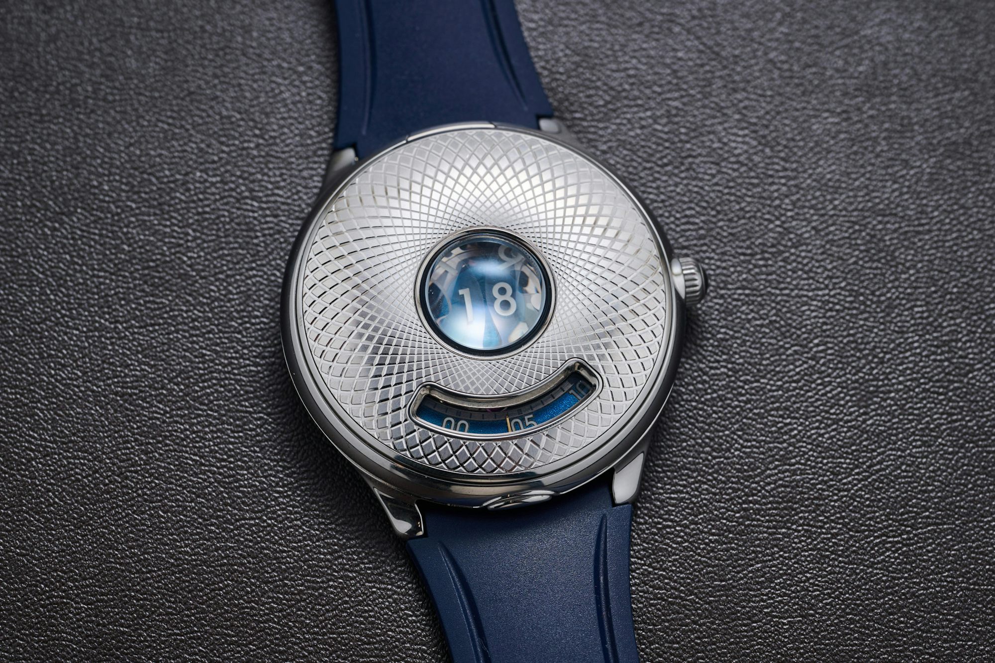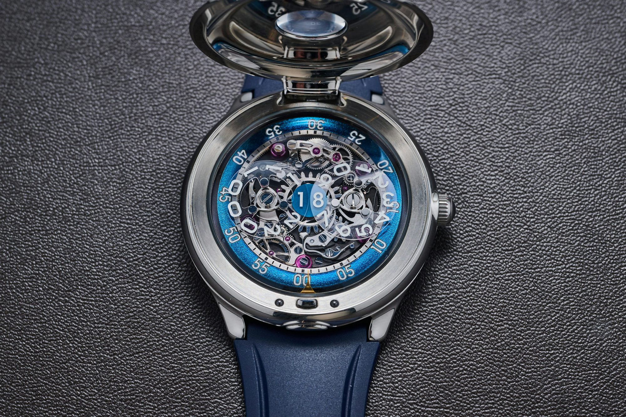 The vortex-like guilloché inlay, produced by Swiss supplier Metalem, on the half-hunter case is offset by two cutouts, the most significant being the cyclops-like domed magnifier that presents the 24-hour display with the case closed, while a curved opening below shows the minutes function. The hinged cover pops open by pressing an oblong button between the lower lugs, revealing the in-house Caliber 10 movement, which is reflected in the mirror-polished underside of the case lid.