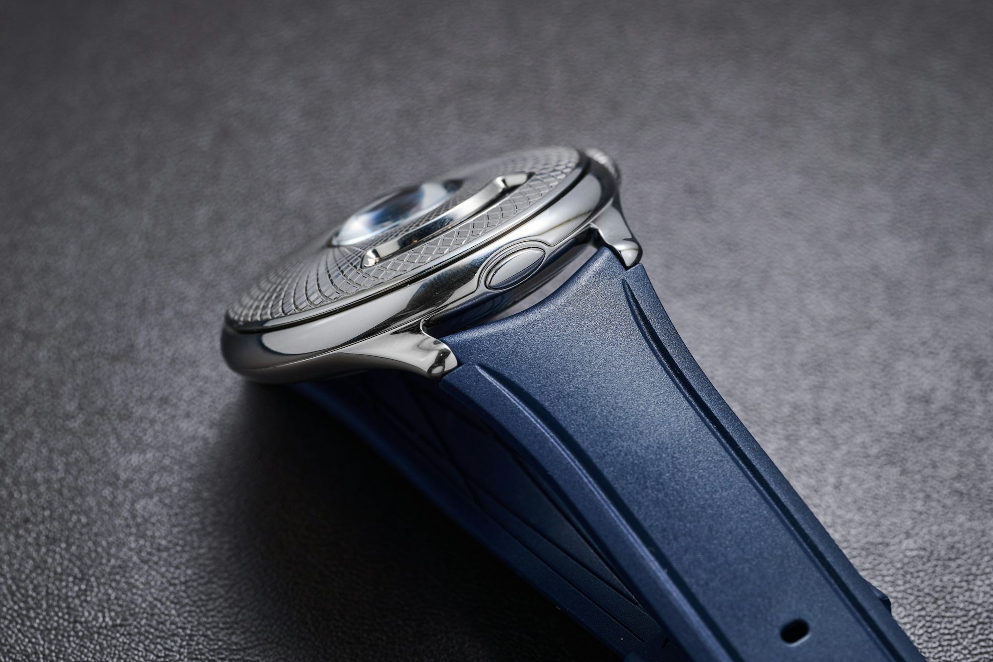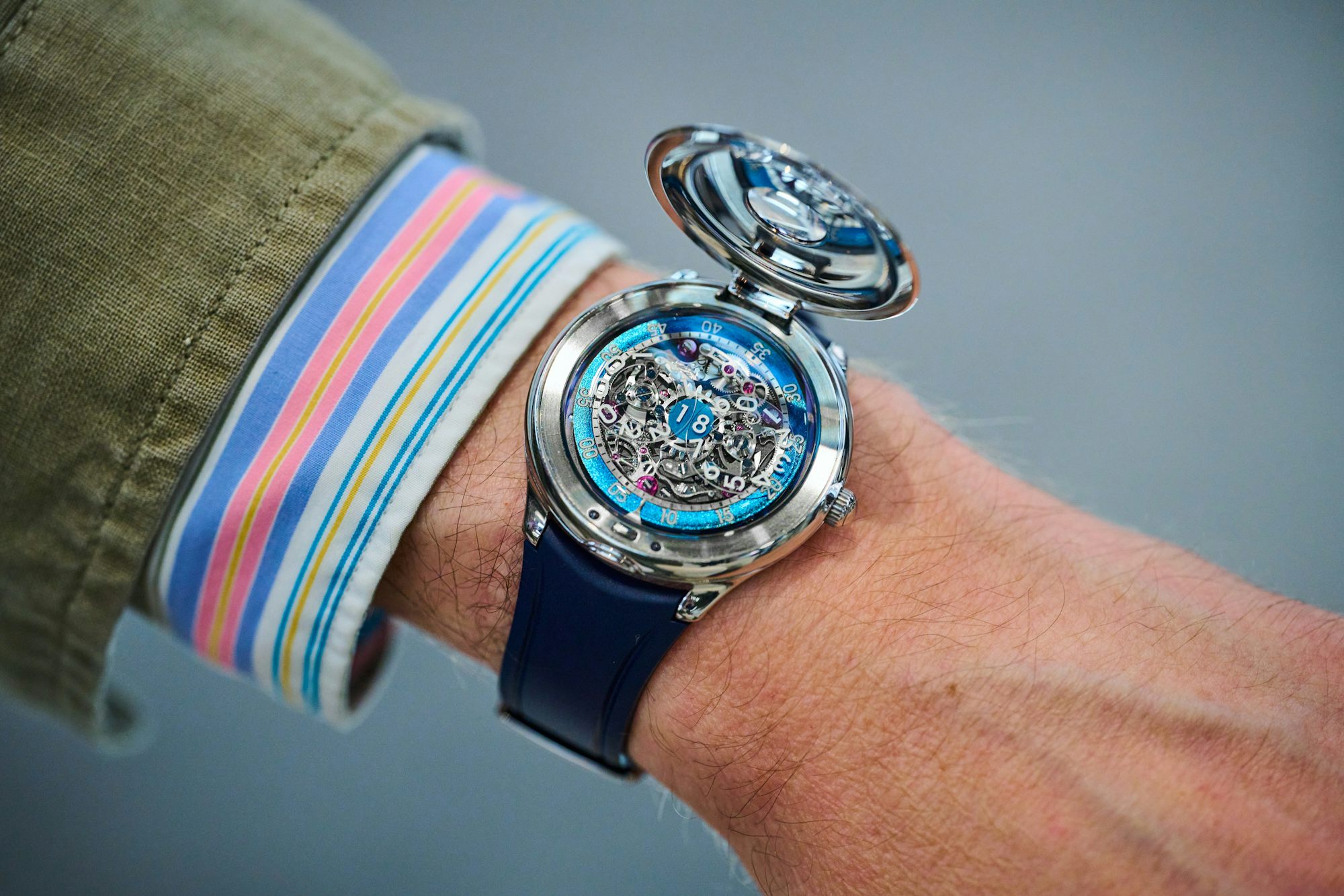 Employing finishing techniques including sandblasted and circular polished, rhodium-plated bridges with beveling, and black polished springs, the movement provides a sea of contrasting levels, finishes, and textures to get lost in under a loupe. Both the steel and 18 karat 3N yellow gold models have 19 millimeter lug widths and come on the same blue rubber strap that isn’t too stiff to wrap comfortably on the wrist and keeps the mood of the piece none-too-serious or self-important. One note, on two of the three prototype versions of the watch that were at Dubai Watch Week, the jumping hour had stopped ‘jumping’ on the hour. This was after the watches had been handled, manipulated, and pawed by hundreds of visitors to the Czapek booth over about four or five days. The hour wheels would rotate when manipulated by turning the crown, but not under the power of the movement. Czapek says the prototype movements have now been repaired, and they don’t expect any issues with the caliber when delivery of the watches begins in Q2 next year.