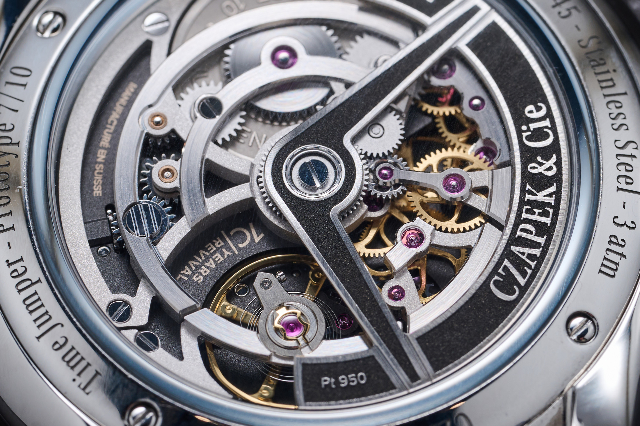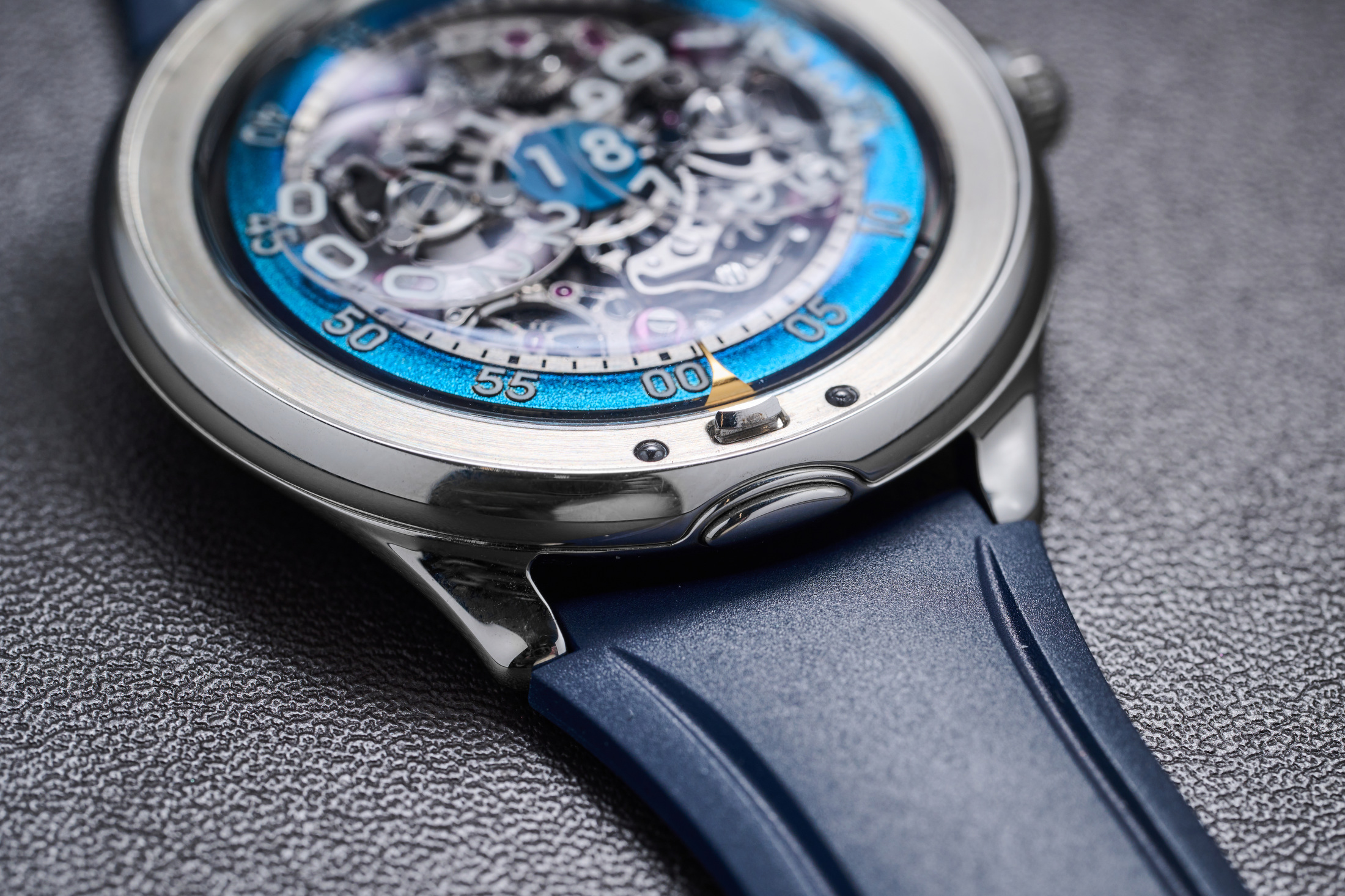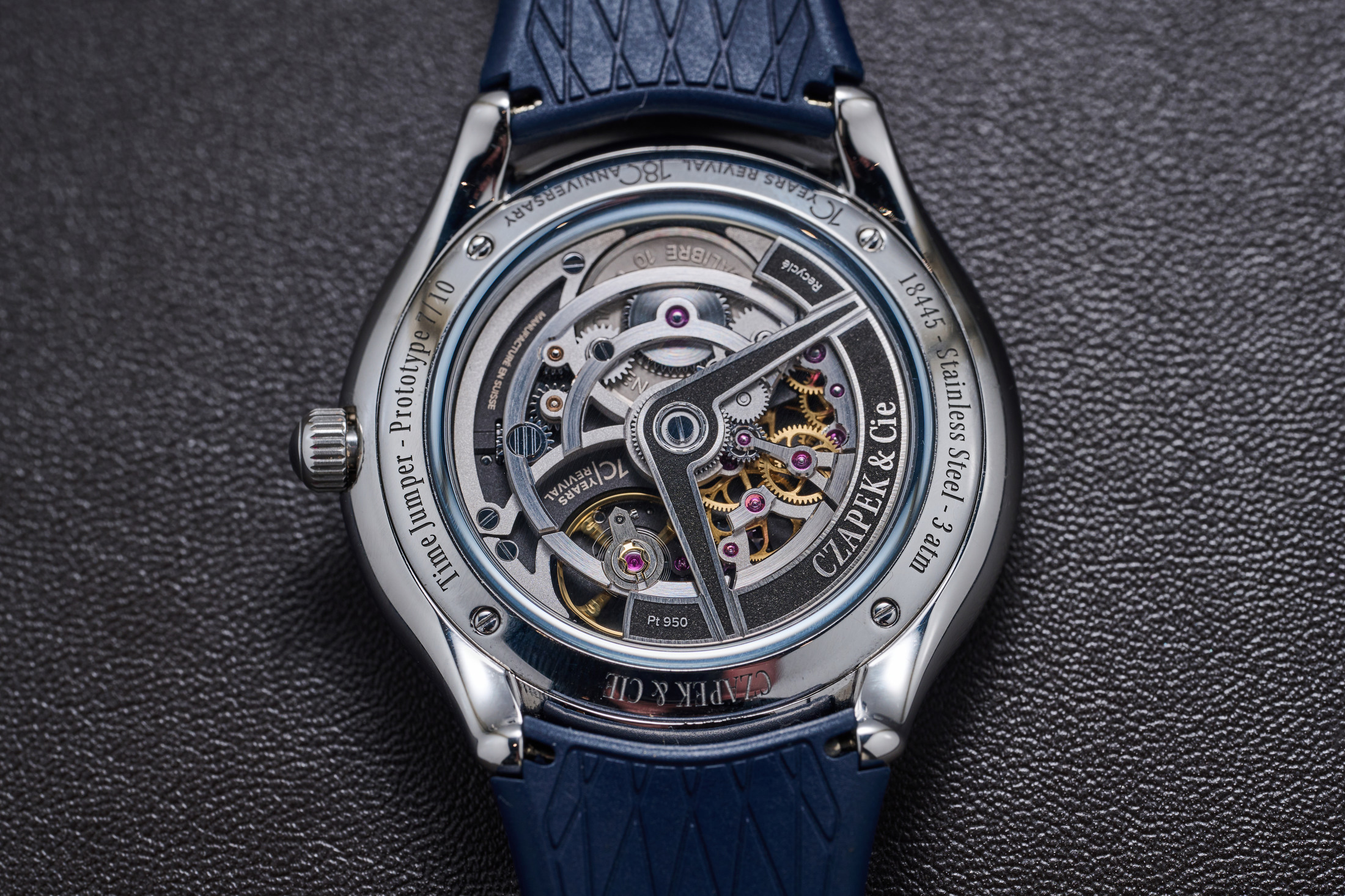 Employing finishing techniques including sandblasted and circular polished, rhodium-plated bridges with beveling, and black polished springs, the movement provides a sea of contrasting levels, finishes, and textures to get lost in under a loupe. Both the steel and 18 karat 3N yellow gold models have 19 millimeter lug widths and come on the same blue rubber strap that isn’t too stiff to wrap comfortably on the wrist and keeps the mood of the piece none-too-serious or self-important. One note, on two of the three prototype versions of the watch that were at Dubai Watch Week, the jumping hour had stopped ‘jumping’ on the hour. This was after the watches had been handled, manipulated, and pawed by hundreds of visitors to the Czapek booth over about four or five days. The hour wheels would rotate when manipulated by turning the crown, but not under the power of the movement. Czapek says the prototype movements have now been repaired, and they don’t expect any issues with the caliber when delivery of the watches begins in Q2 next year.