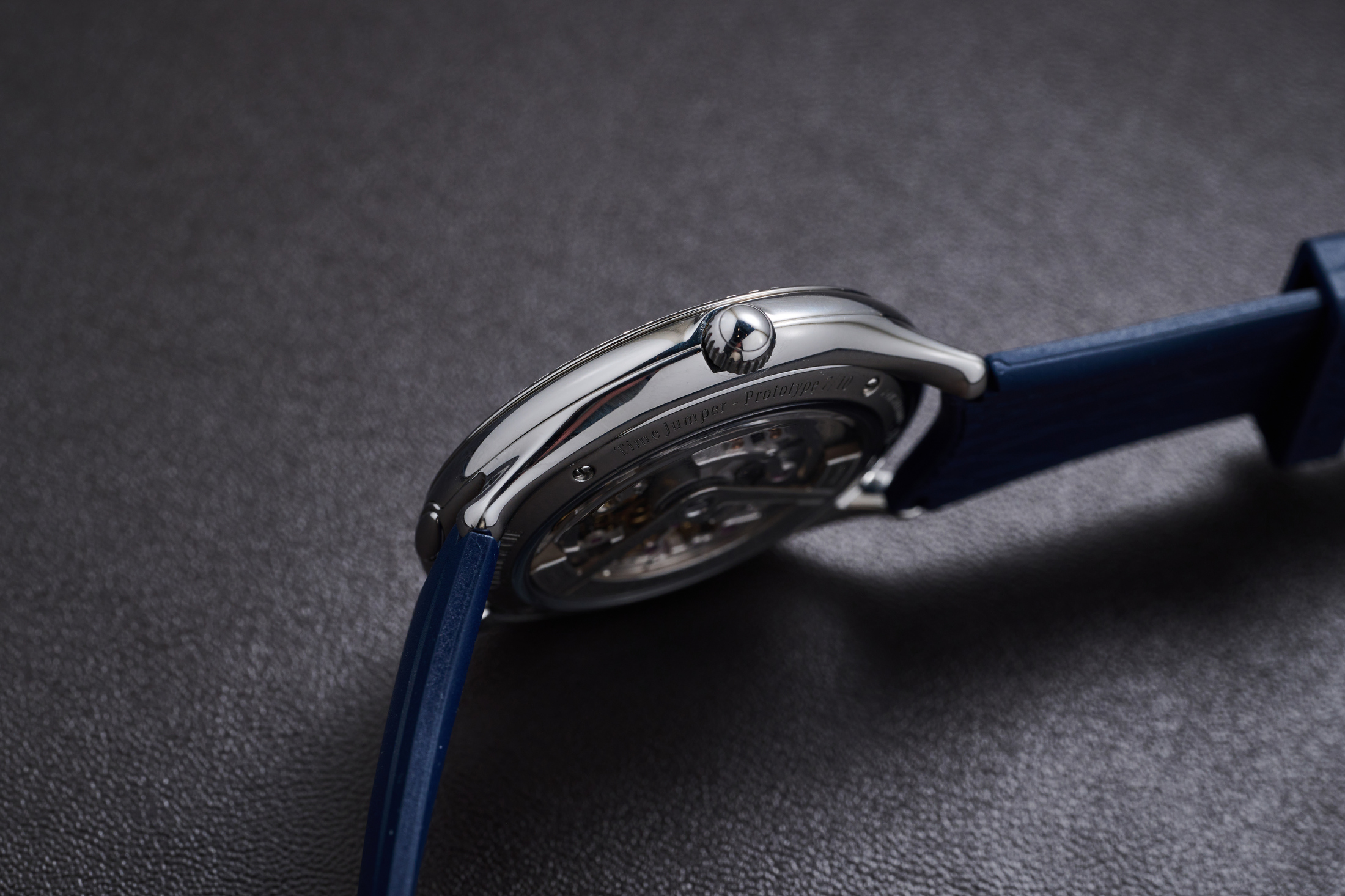 The new, self-winding movement, driven by a platinum rotor, is on full display with the Time Jumper. It’s plainly visible through both the front with the hinged case open, showing the skeletonized mechanism with finished sapphire jumping hour wheels and the blue rotating outer minutes ring, as well as through the sapphire crystal open caseback. Beating at 4hz or 28,800 VpH, it has a power reserve of 60 hours.