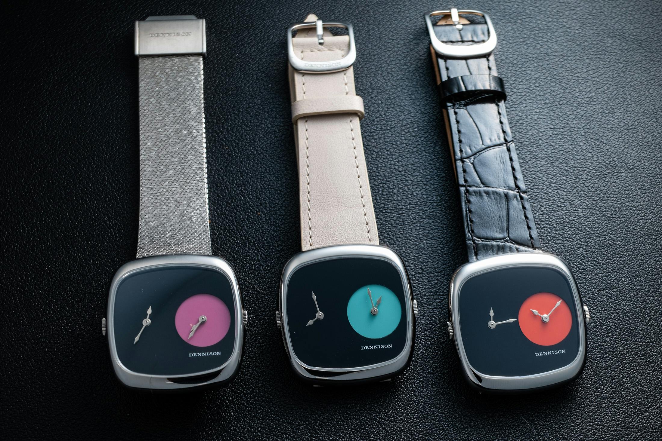 What’s truly new here, besides the fresh dials, is the option, for the first time from Dennison, of a metal bracelet. Unlike these Capsule Collection dials, the bracelet feels very throwback, flashy, and glamorous, in the best way possible. It evokes the thin and drapey bracelets of design-driven, shaped watches that had to be cut to fit the wearer. Thankfully, this has an easy-to-use pressure clasp system that feels plenty secure. No anxiety-inducing trips to the jeweler for cutting and sizing required. Nicely done.