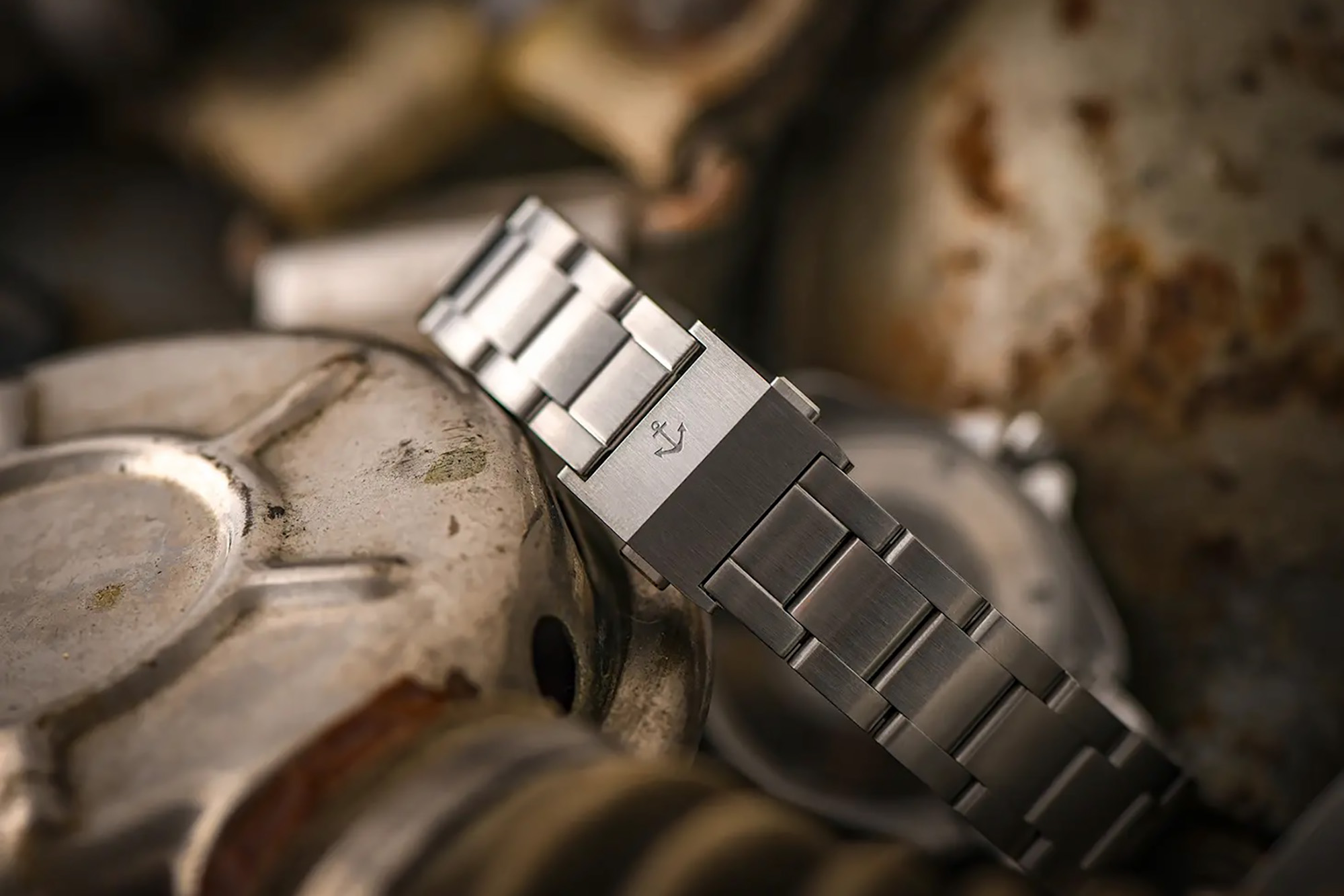 Of course, if the ‘Dive Bund’ isn’t your thing, the pad can be easily removed, leaving you with a more traditional dive strap with an anchor logo buckle in steel. And, for a few euros more (50, to be exact), you also have a steel bracelet option. There’s no micro-adjustment on the brushed bracelet, but the triangle-shaped clasp is unique and subtly stamped with the brand’s logo.