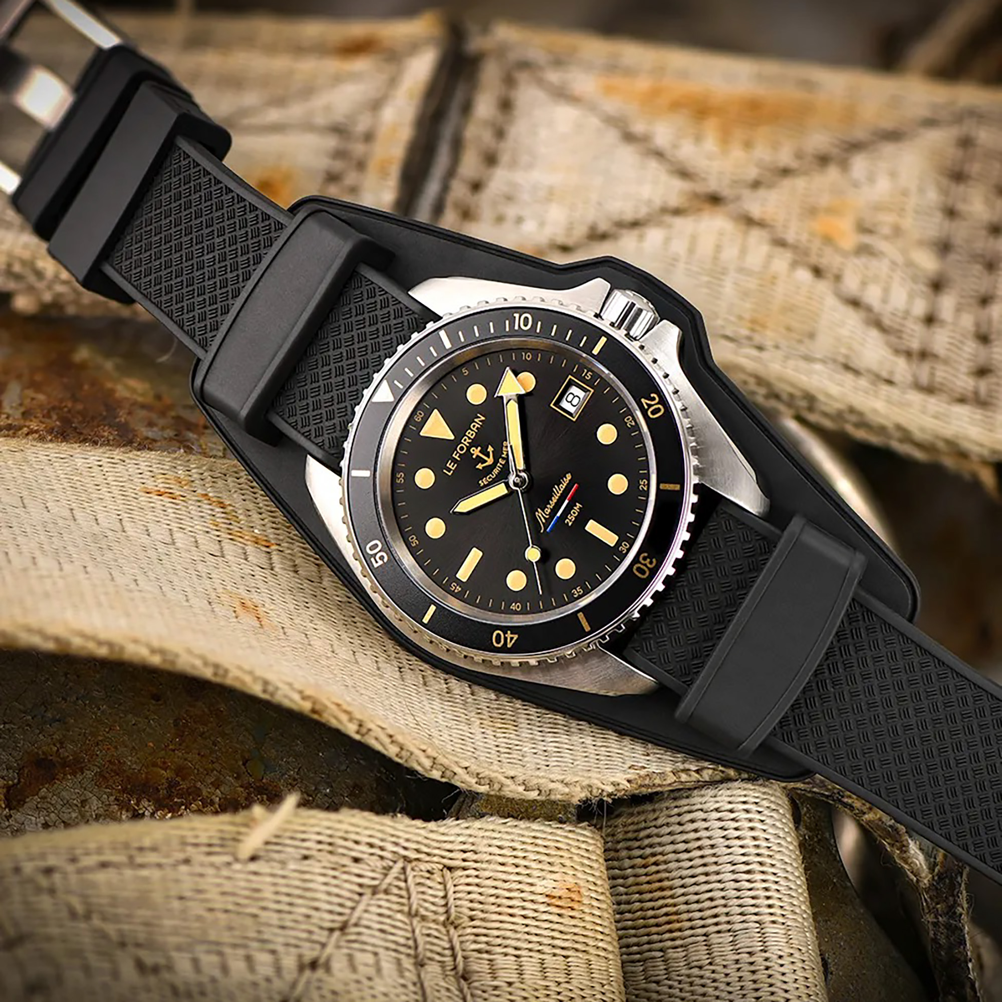 Which brings us to Le Forban’s Marseillaise dive watch, offering the first time I’ve personally experienced a diver on a rubber Bund strap. The French brand’s timepiece and its multiple strap options carry significant credibility, having been designed by Eddy Burgener, the same Swiss-based creator responsible for the original TAG Heuer Formula 1, among others.