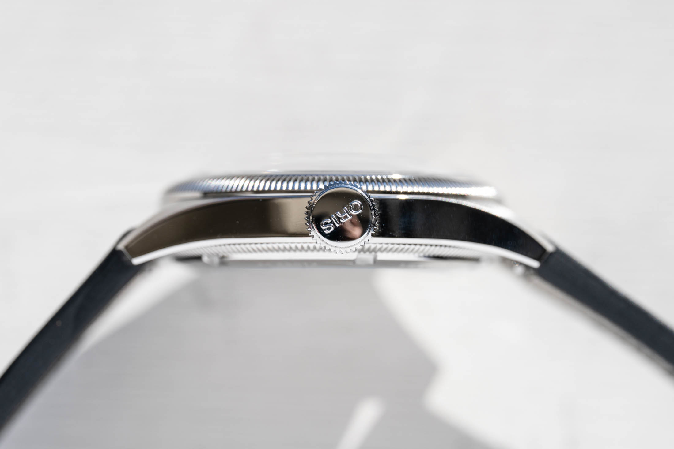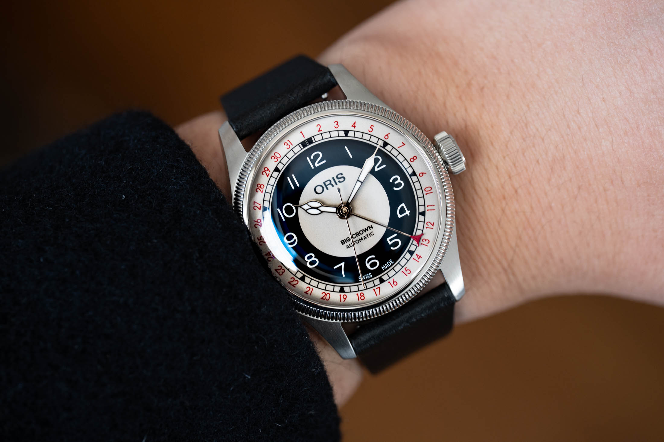 The main attraction is the “Bullseye” dial, a tuxedo take that the brand cites as inspired by an Oris pocket watch dial from the 1910s. A high-contrast sector dial, the base starts with a layer of light silver for the center and outer rings. The silver is pleasant in execution, with a softness combined with a slightly textured metallic shine that takes on the warmth of the watch’s surroundings — in different environments, the silver shifts between cool grey and warm eggshell. Sandwiched in between is a middle ring of solid black, with hour numerals printed in white Super-LumiNova.