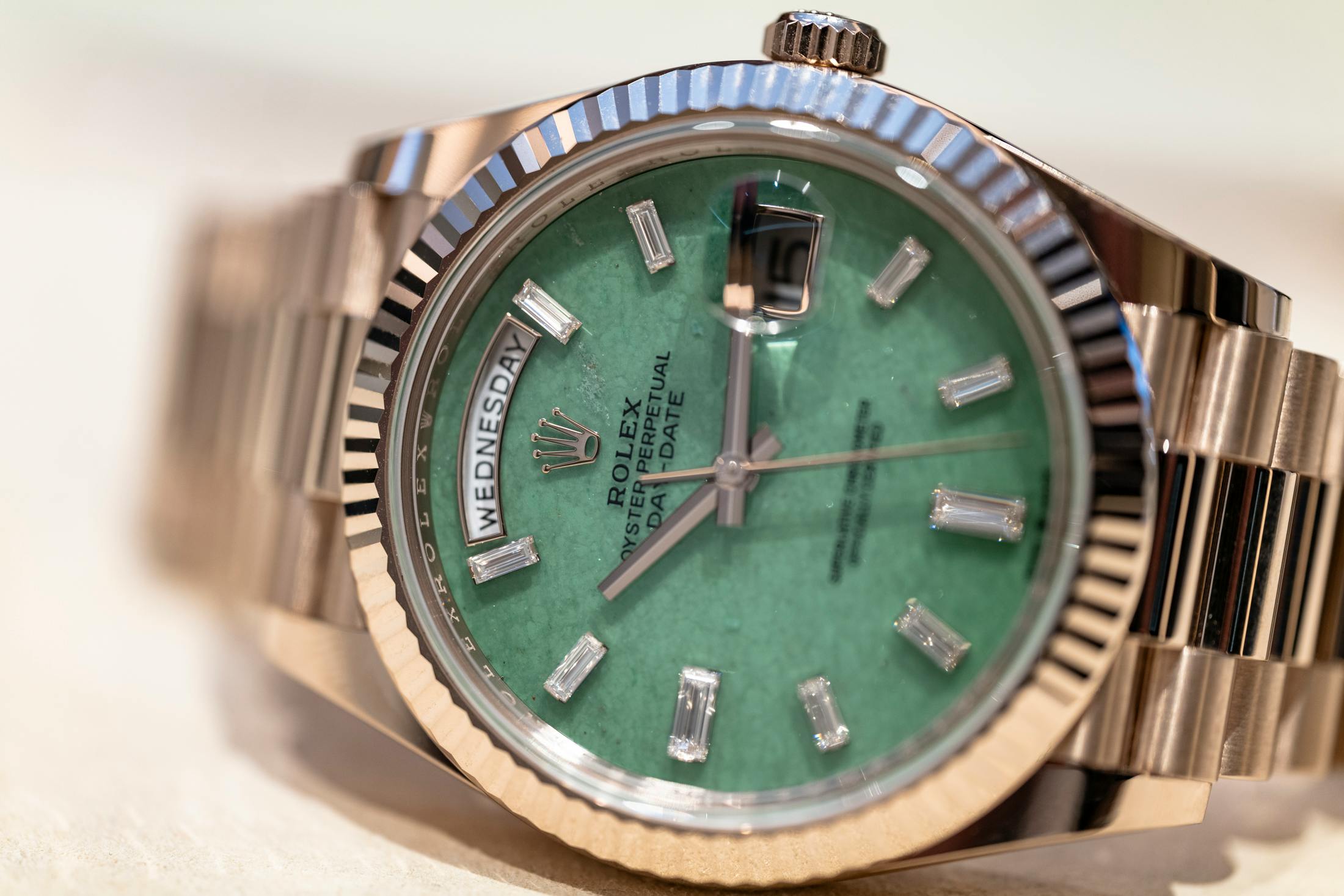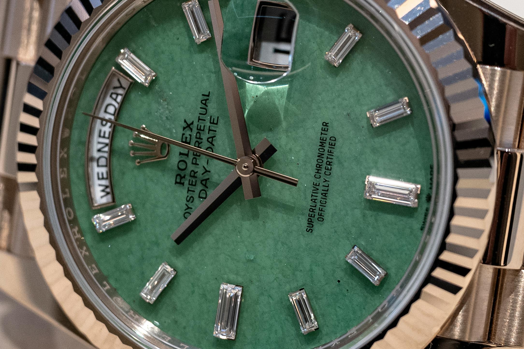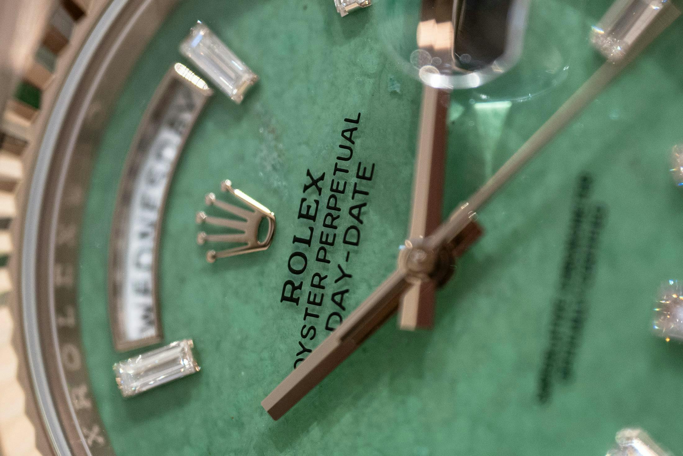 If the case material is the intellectual highlight, the dial is where Rolex gets a little more expressive. The Day-Date pairs its new metal with a light green aventurine dial — a natural stone whose quartz structure produces subtle flecks and shimmering texture across the surface and a color somewhere between jade and light emerald greens. The dial is framed by ten baguette-cut diamond hour markers, leaving space only for the day and date apertures. The result is visually rich without feeling overloaded. A balance Rolex has perfected over decades of gemstone dials.