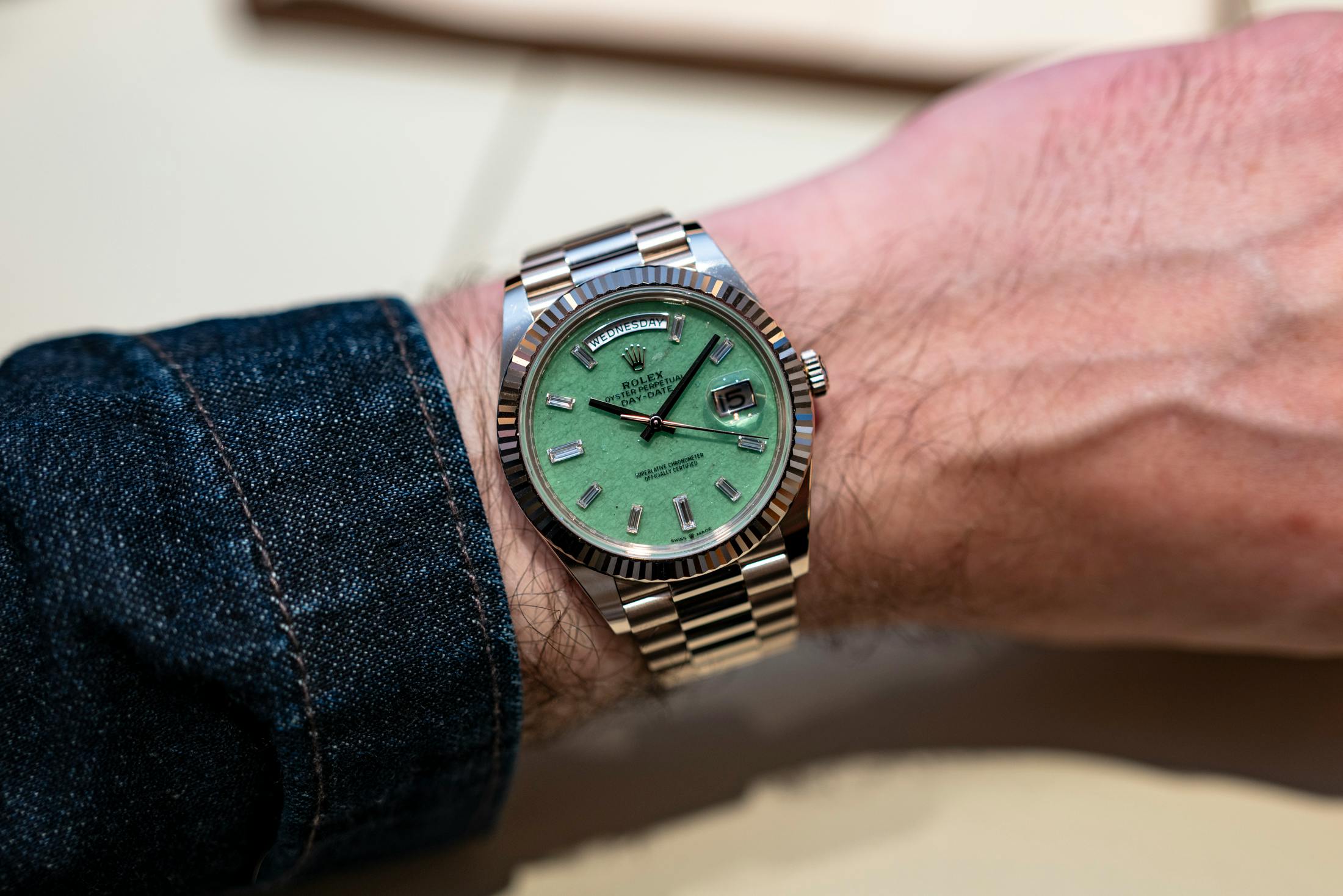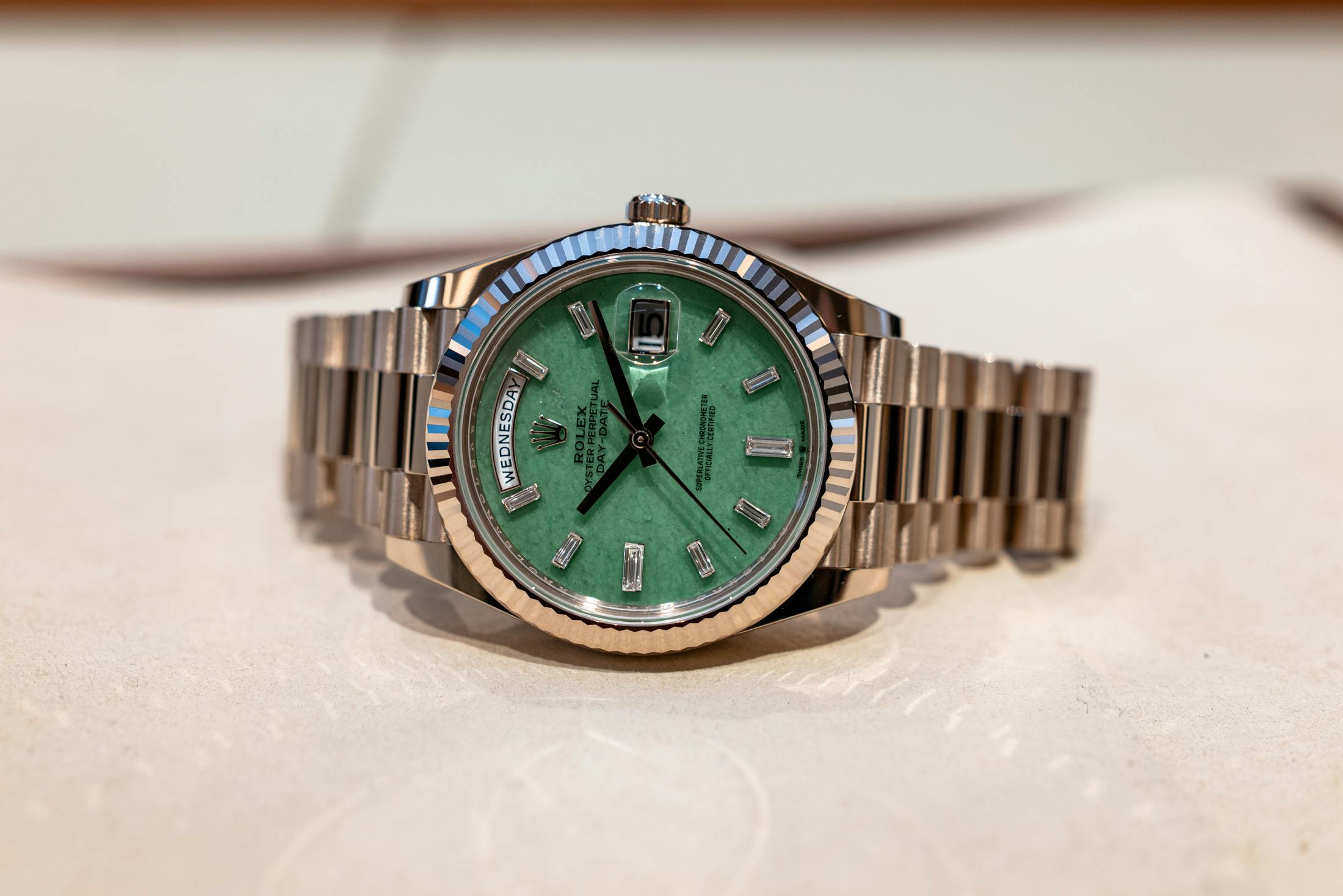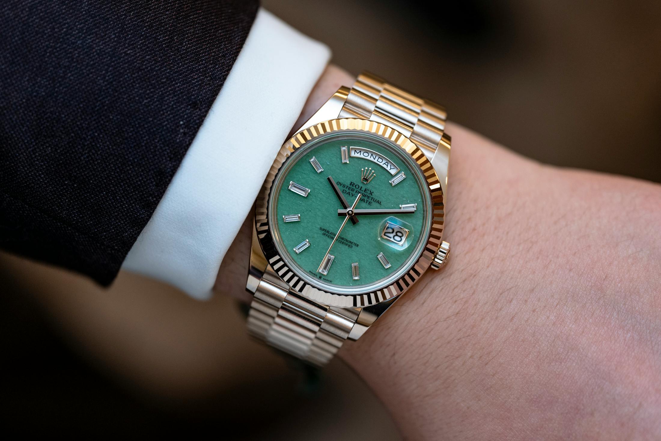 If the case material is the intellectual highlight, the dial is where Rolex gets a little more expressive. The Day-Date pairs its new metal with a light green aventurine dial — a natural stone whose quartz structure produces subtle flecks and shimmering texture across the surface and a color somewhere between jade and light emerald greens. The dial is framed by ten baguette-cut diamond hour markers, leaving space only for the day and date apertures. The result is visually rich without feeling overloaded. A balance Rolex has perfected over decades of gemstone dials.