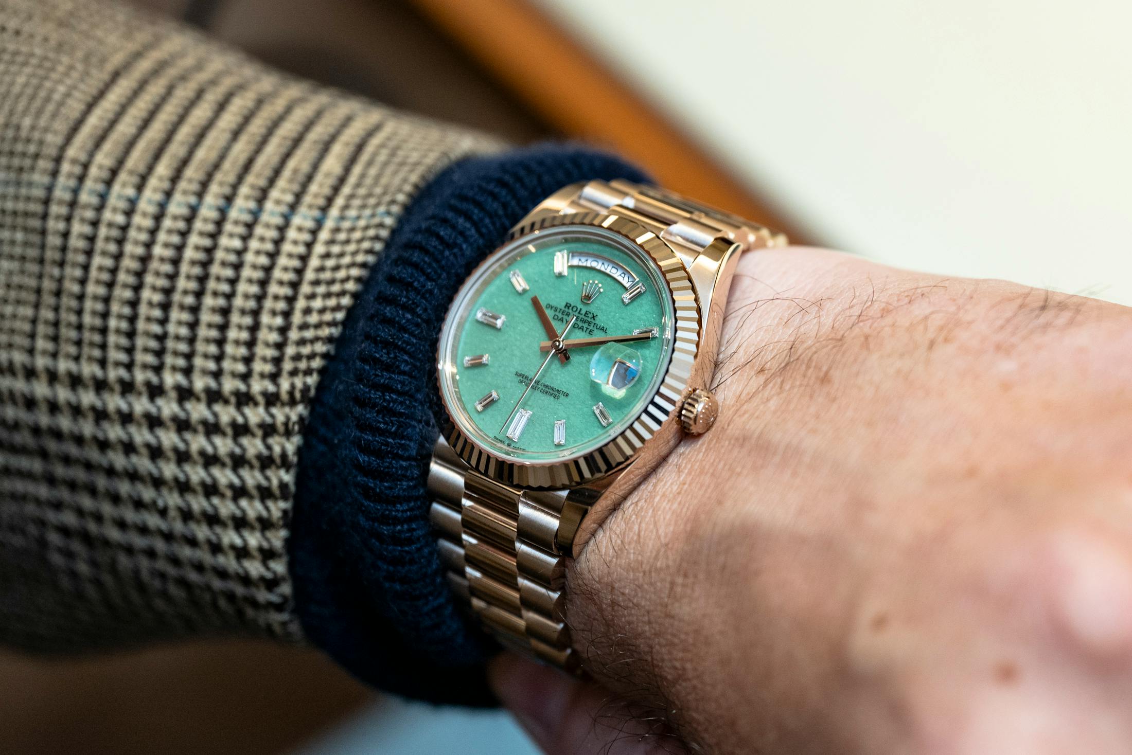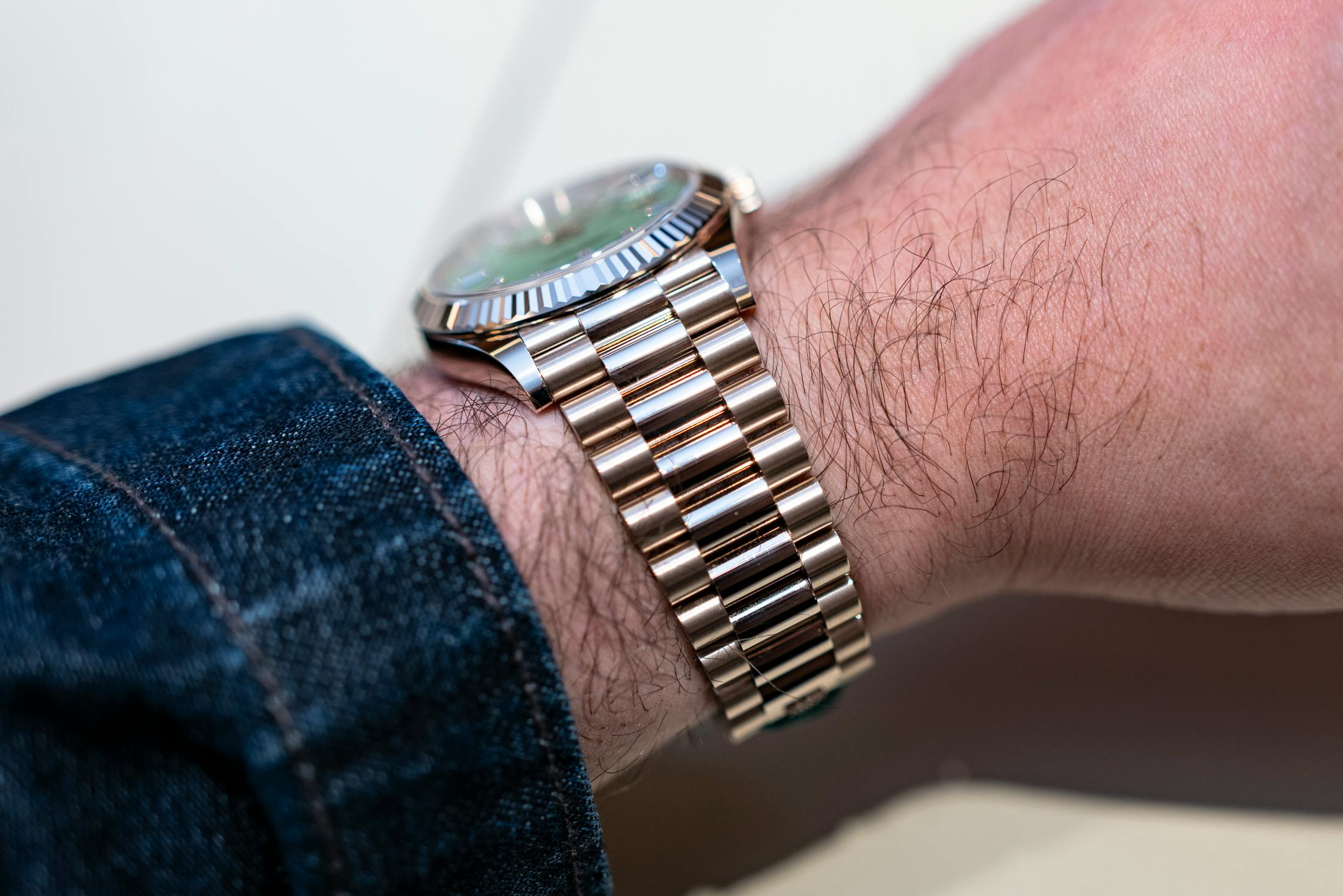 It almost seems as if the new Day‑Date in Jubilee Gold wears a little differently on the wrist than a typical gold Rolex. Yellow gold Day-Dates demand your attention, catching your eye immediately and drawing you in visually. But a Day-Date, in Jubilee Gold, suggests more than it demands. Its glow sits somewhere between yellow gold, Everose, and even a slightly warm white gold, depending on the light. In bright sunlight, I expect it to be more golden, while indoors in artificial light, it can skew cooler and almost champagne-toned.