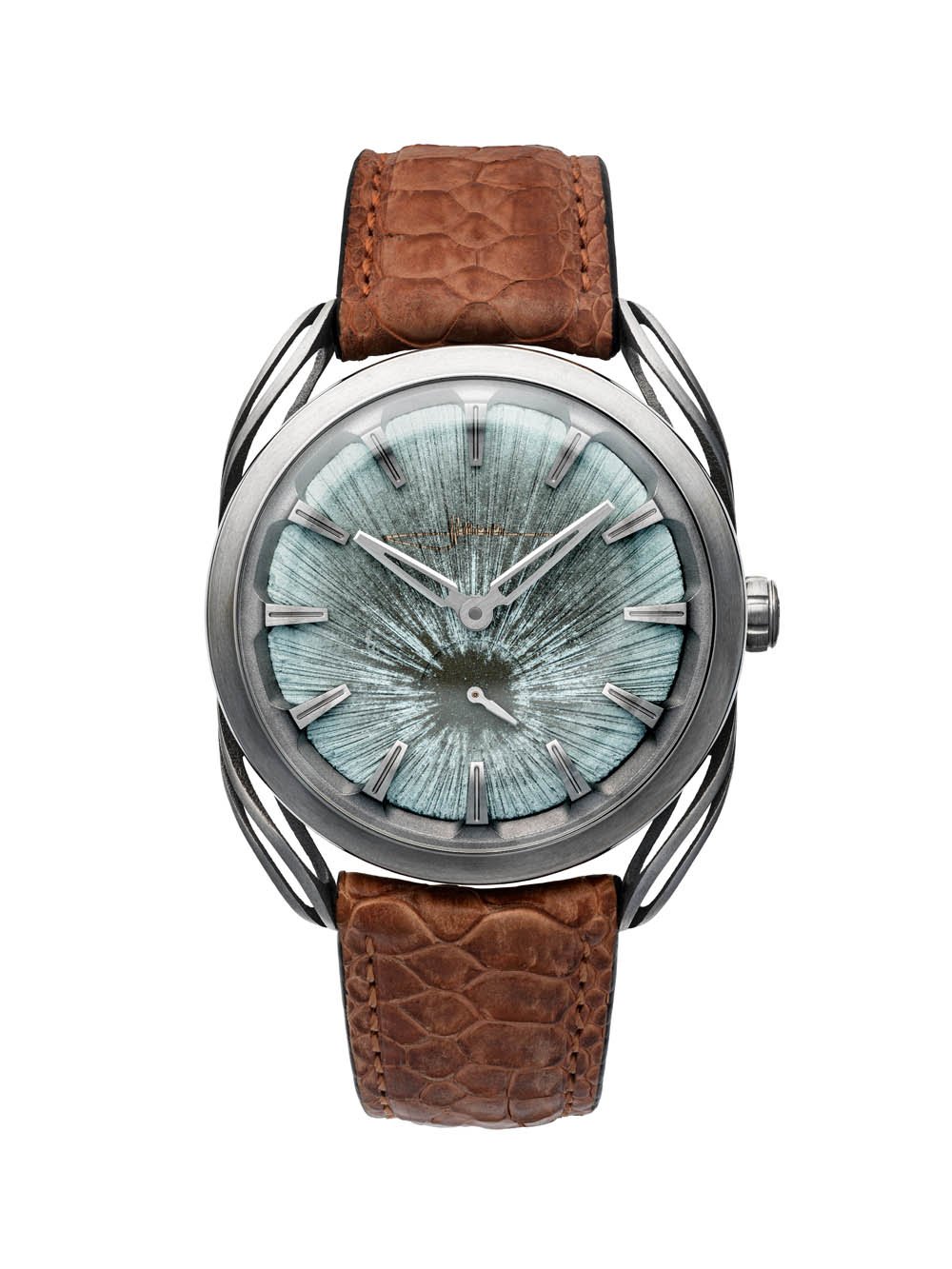 The dial of the LAB 1.S uses a copper oxide patina process that Holthinrichs has employed before in various ways, here claiming that it is perhaps the most expressive relief dial they have ever created. The copper is patinated to a distinctive shade of green, and then the team goes to work on altering it physically through hand carving its surface to create depth and unexpected color combinations. For these dials, carved lines radiate from the 6:00 subdial at various depths, with deeper carvings exhibiting tones of blue and shallower carved surfaces showing up as brown-green. Because this is all done by hand, no two dials will be exactly the same, but you can expect all of them to be impressively intricate and visually interesting.