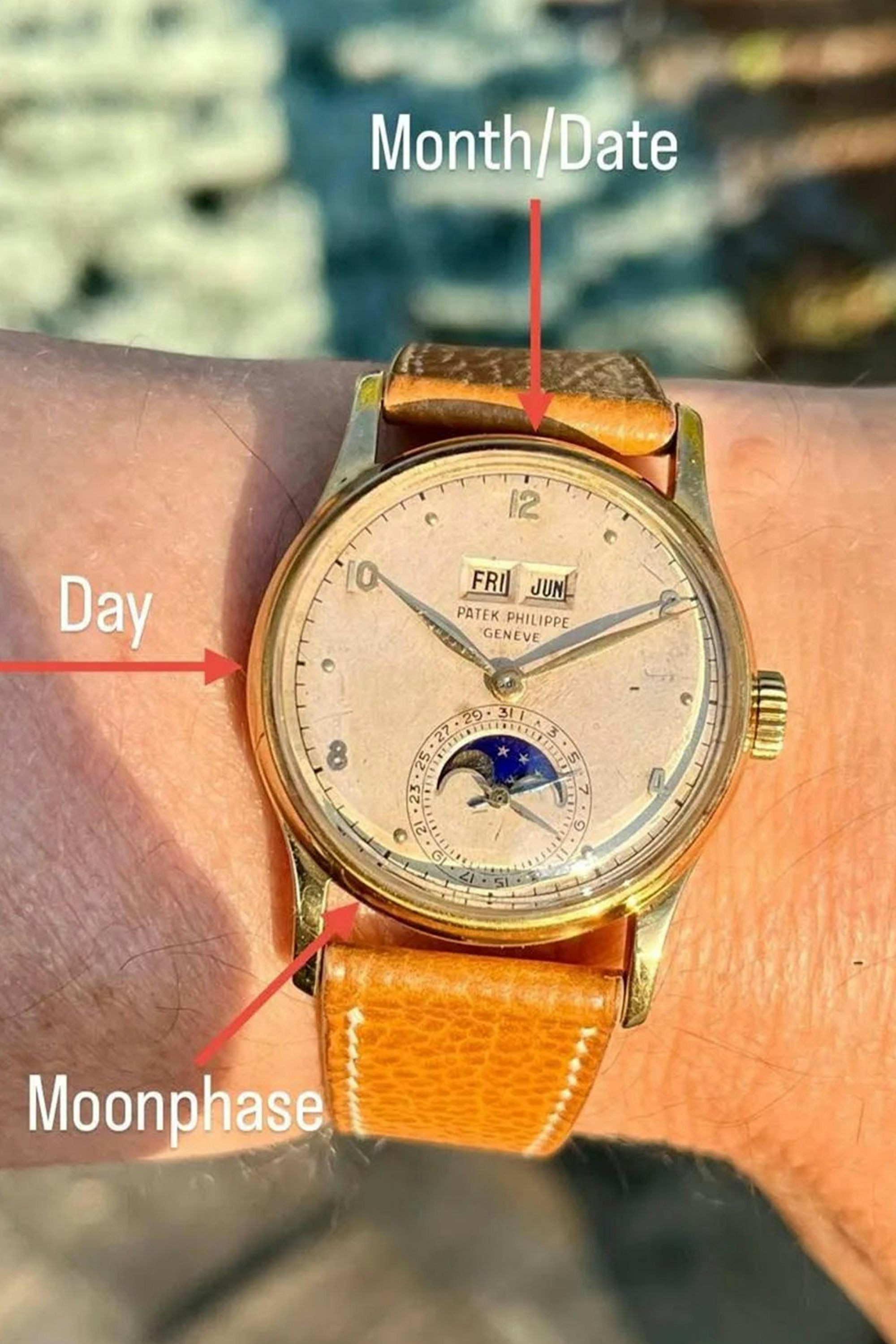 The moon-phase corrector is between the lower lugs near seven o’clock. A day corrector is on the outer band close to nine o’clock, and the month corrector is between the upper lugs near twelve o’clock. The last three digits of the serial number are engraved inside the case wall.
