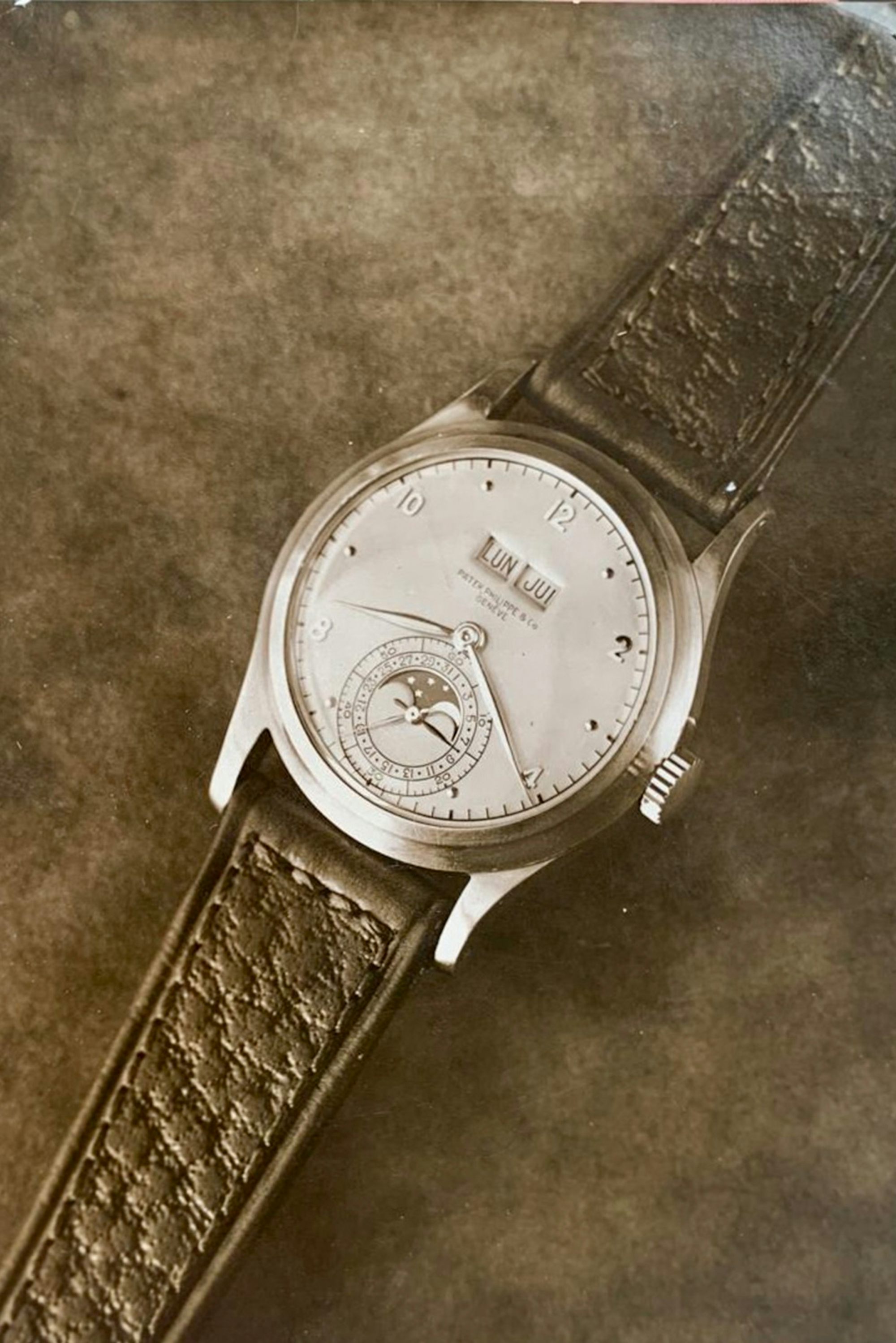 A black dial ref. 1526J (one each in pink and yellow gold is known), dating to 1951. It originally appeared at Sotheby’s New York auction in 1989, where it achieved the second-highest lot price of $121,000 behind the AP John Schaeffer Minute Repeater.