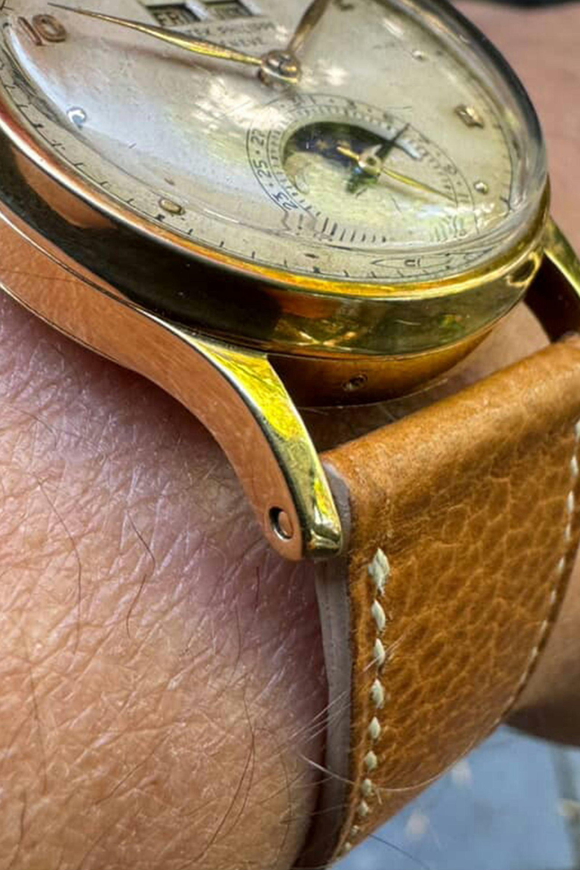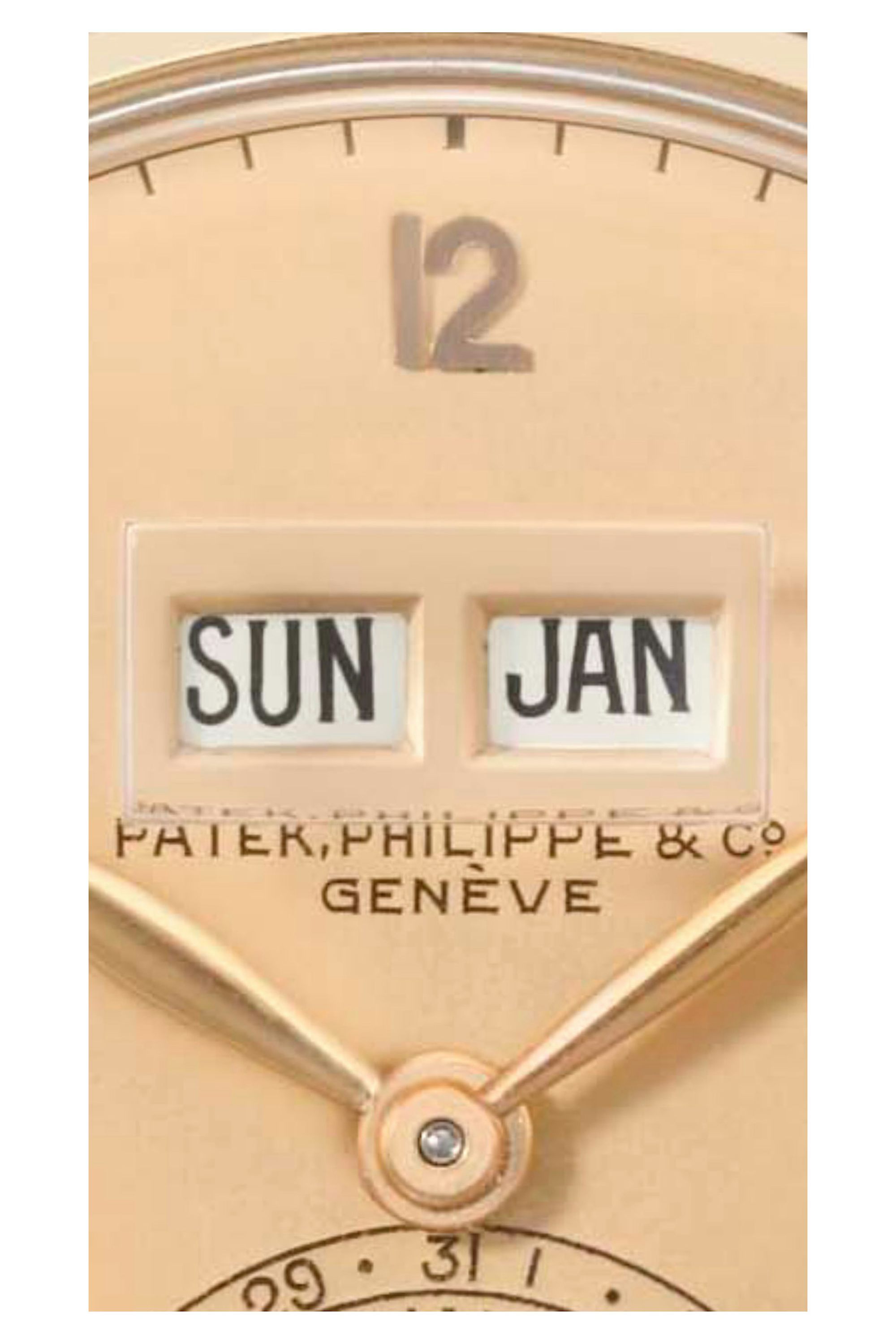 The Third series from 1948–1952 is immediately recognizable by the short signature “Patek Philippe”, which replaced the long signature “Patek Philippe & Co” during 1948. Don’t be fooled, though, by earlier examples that were improperly restored with short signatures and should have long signatures based on their serial numbers, dating them to pre-1948. Auction listings from the past are riddled with mistakes, and scholarship at the time was lacking to properly describe true condition. Additionally, the sub-dial continued to iterate with an open seconds chapter and a singular date display (as we’ll discuss later), in addition to the aperture border bevels becoming a bit more defined. The calendar window bevels are now larger, more defined, and the divider between them is thinner. The case size remained 34mm, but the lug and bezel design changed slightly (as is illustrated in a later section comparing it to the first and second series). Hallmarks are usually seen under a lug and on the case side. The subject example has a second 18K hallmark on the case back for US market requirements.