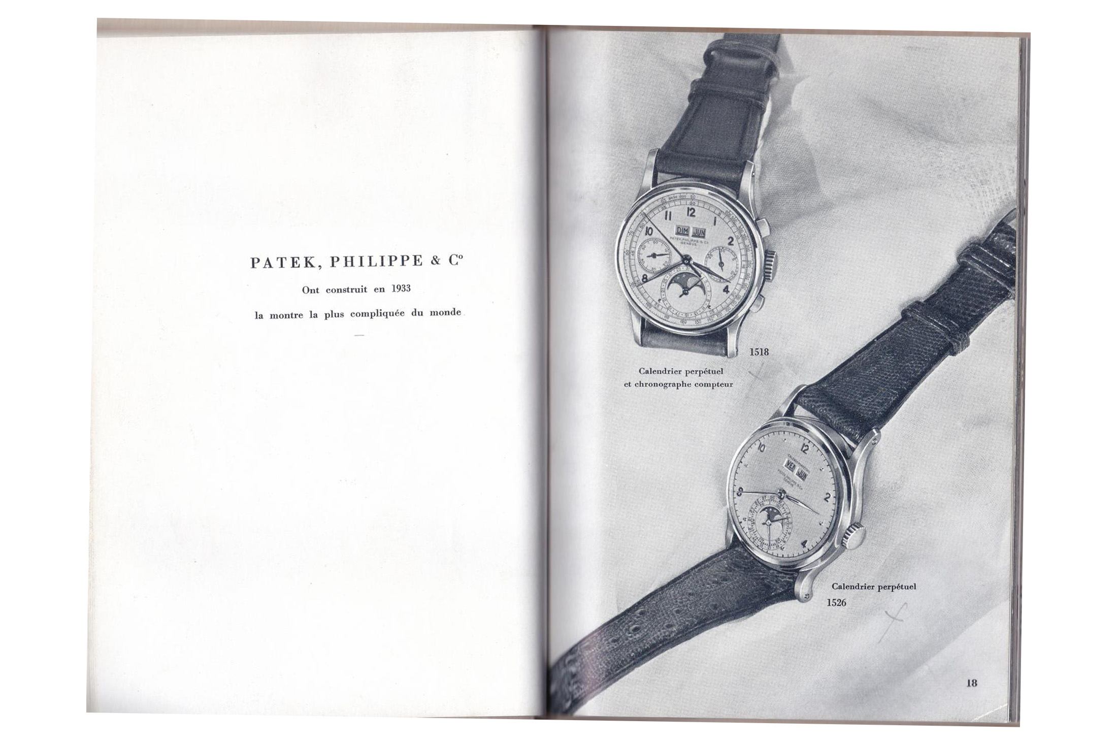 Finally, completing the trio, a possibly unique second series ref. 1526J example from 1943; the sub-dial shows the double railway, and its serial numbers place it in a second series range. This dial type with script “Calend. Perpetuel” was only ever seen in an early Patek catalogue (lower images), besides this example, to my knowledge. This third example from the collection came with the original papers, invoice, and box. Auctioned in 2007 by Christie’s for CHF 420,000. Images courtesy of Christie’s and John Nagayama.