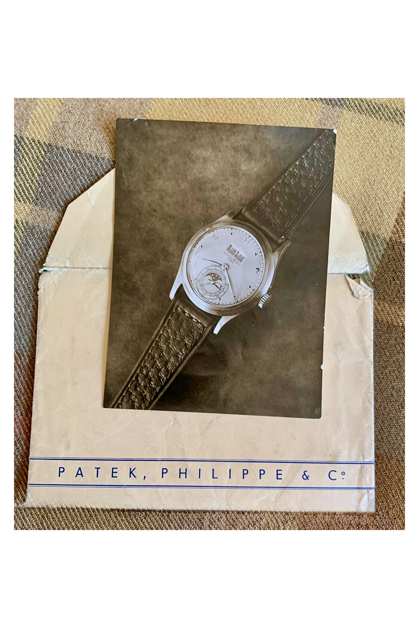 It’s interesting to take a trip back in time to see how ref. 1526 was initially offered to the public. Above are period print marketing images of an original cardstock and envelope that document the initial appearance and presentation of a first-series example, as shown on a box-stitch pigskin strap.