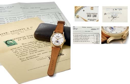 A black dial ref. 1526J (one each in pink and yellow gold is known), dating to 1951. It originally appeared at Sotheby’s New York auction in 1989, where it achieved the second-highest lot price of $121,000 behind the AP John Schaeffer Minute Repeater.