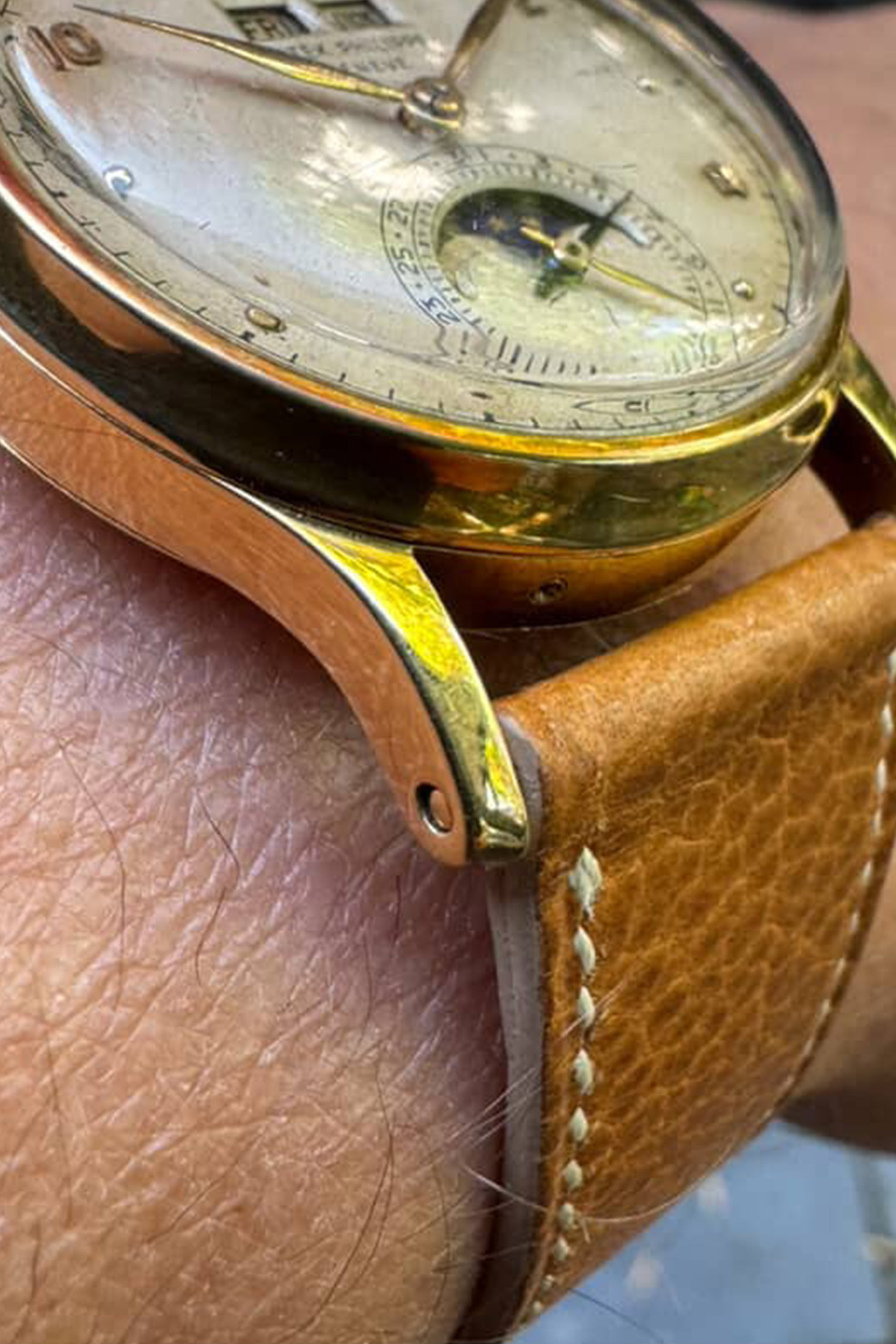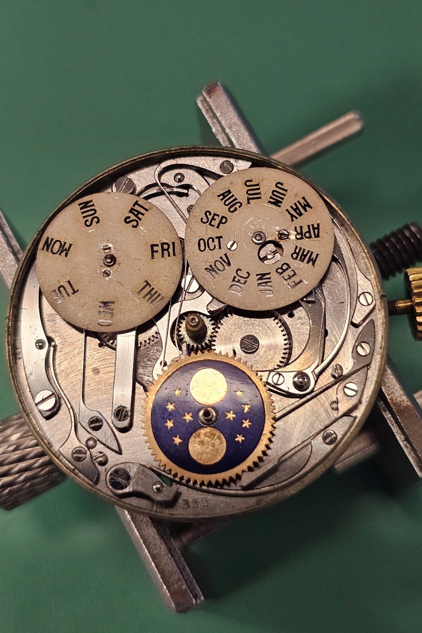 Backside of dial detail (above) showing original tracings around the entire moon-phase aperture. These are often removed entirely or interrupted by sanding or filing when dial restoration work is performed.