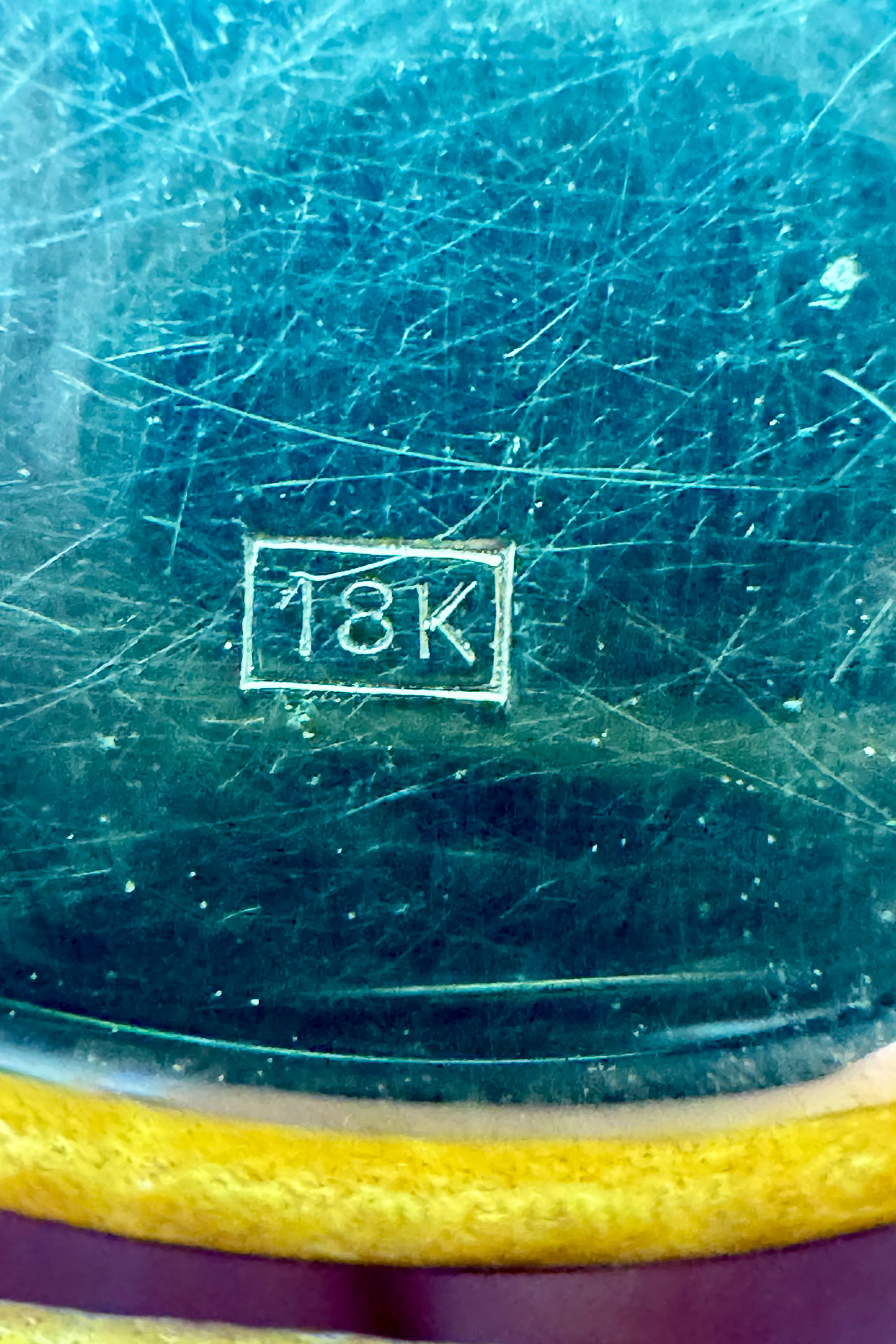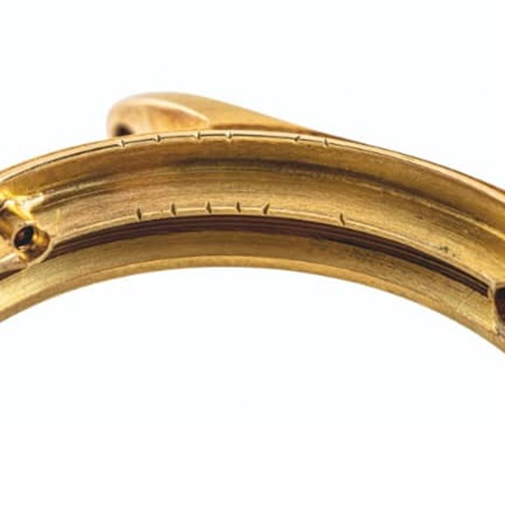 The case back of the subject example shows a personalized period engraving, rectangular bordered 18K hallmark stamping on the back for the US market (instead of Helvetia on the side) with an additional Helvetia hallmark under one lug. The bezel is a separate component, and the case pieces all have markings to match them up with their respective parts. A slight crease is evident on the outer edge of the case, allowing an access point for removal of the case back and bezel during servicing.