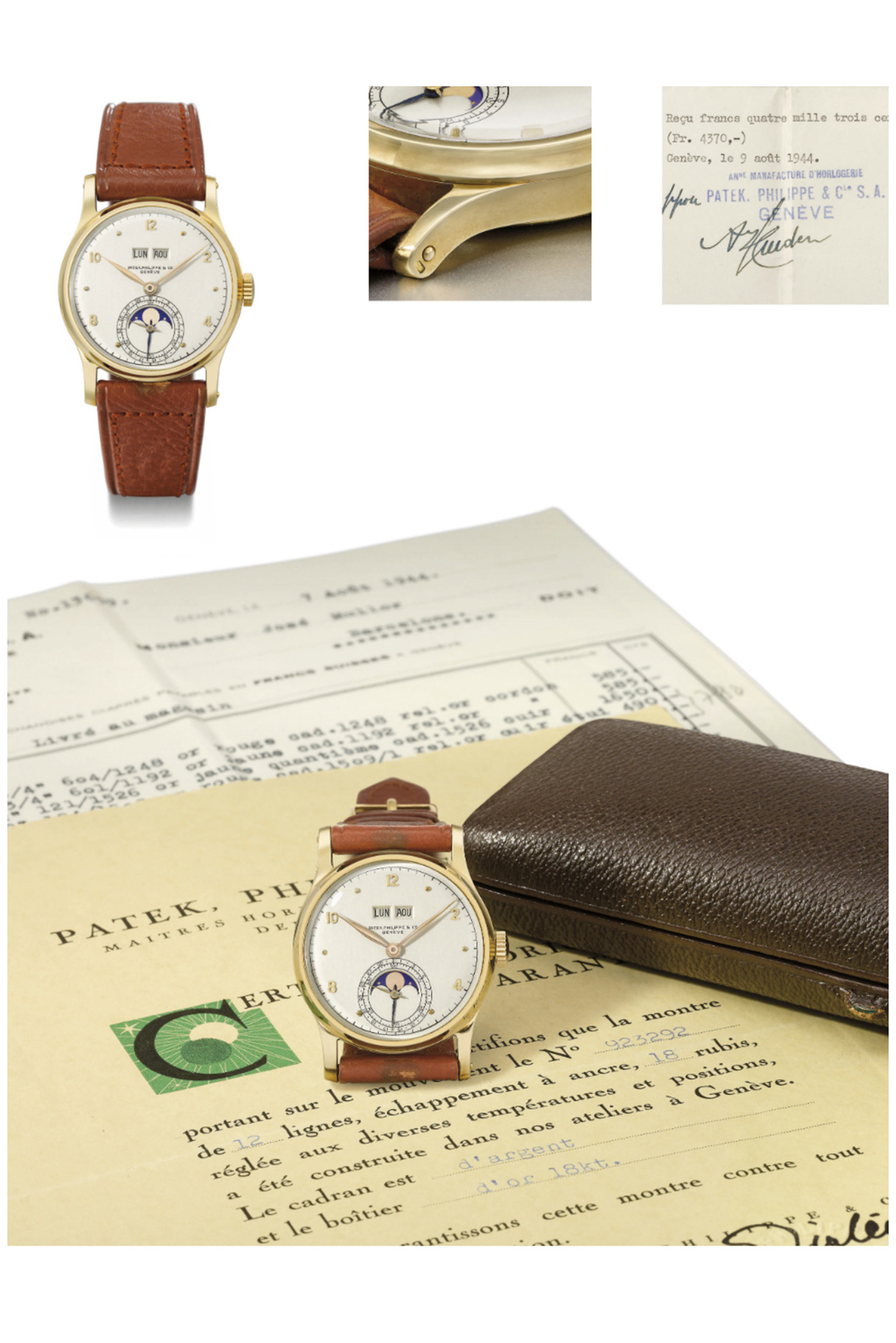 It’s an extremely rare, first series, large Arabic markers dial ref. 1526 from 1942 in exceptional condition for the age. Achieved auction sale of €793,000 in April of 2024. Photos showing additional details and aspects of the example include the original and complete set of paperwork, box stitch pigskin strap, stamped buckle, and spare crystal in its marked envelope and box. Photos courtesy of Ignacio Coll, Ancienne Vintage Gallery.
