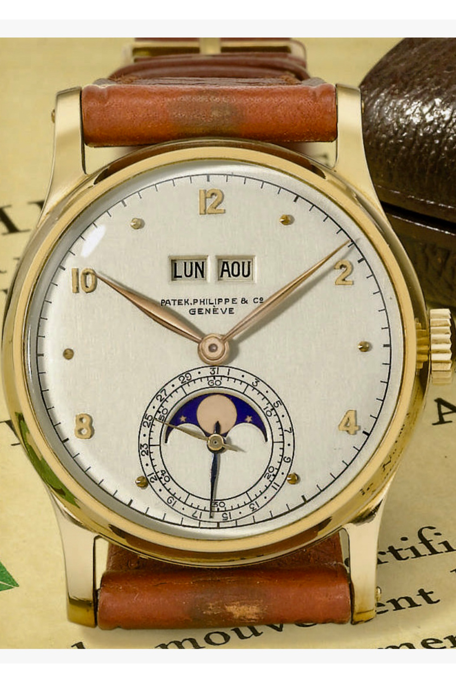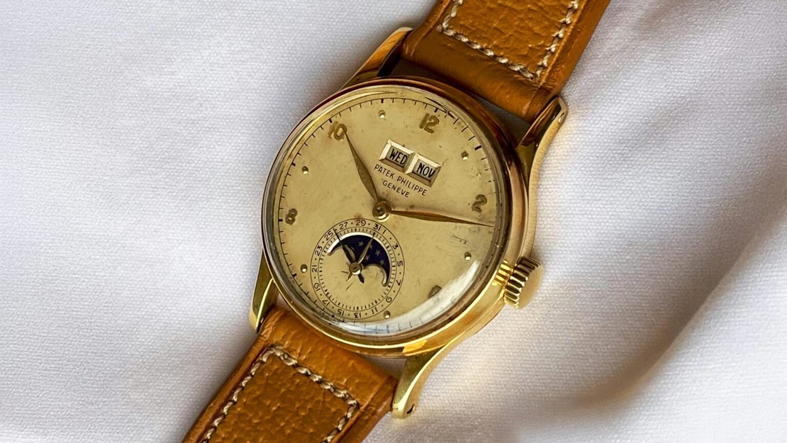 The dial consists of an 18K-gold blank base that was silvered and given an opaline finish on the top side. Gold dial blanks were scarcely created by Stern Freres for Patek and reserved for limited production references. Save for a few special order examples, the hour markers alternate between Arabic and gold dots. The layout is aesthetically pleasing and balances well with the calendar windows on top and the date, sub-seconds, and moon phase features aligned vertically on the bottom with a minute track of engraved enamel on the outer dial periphery.