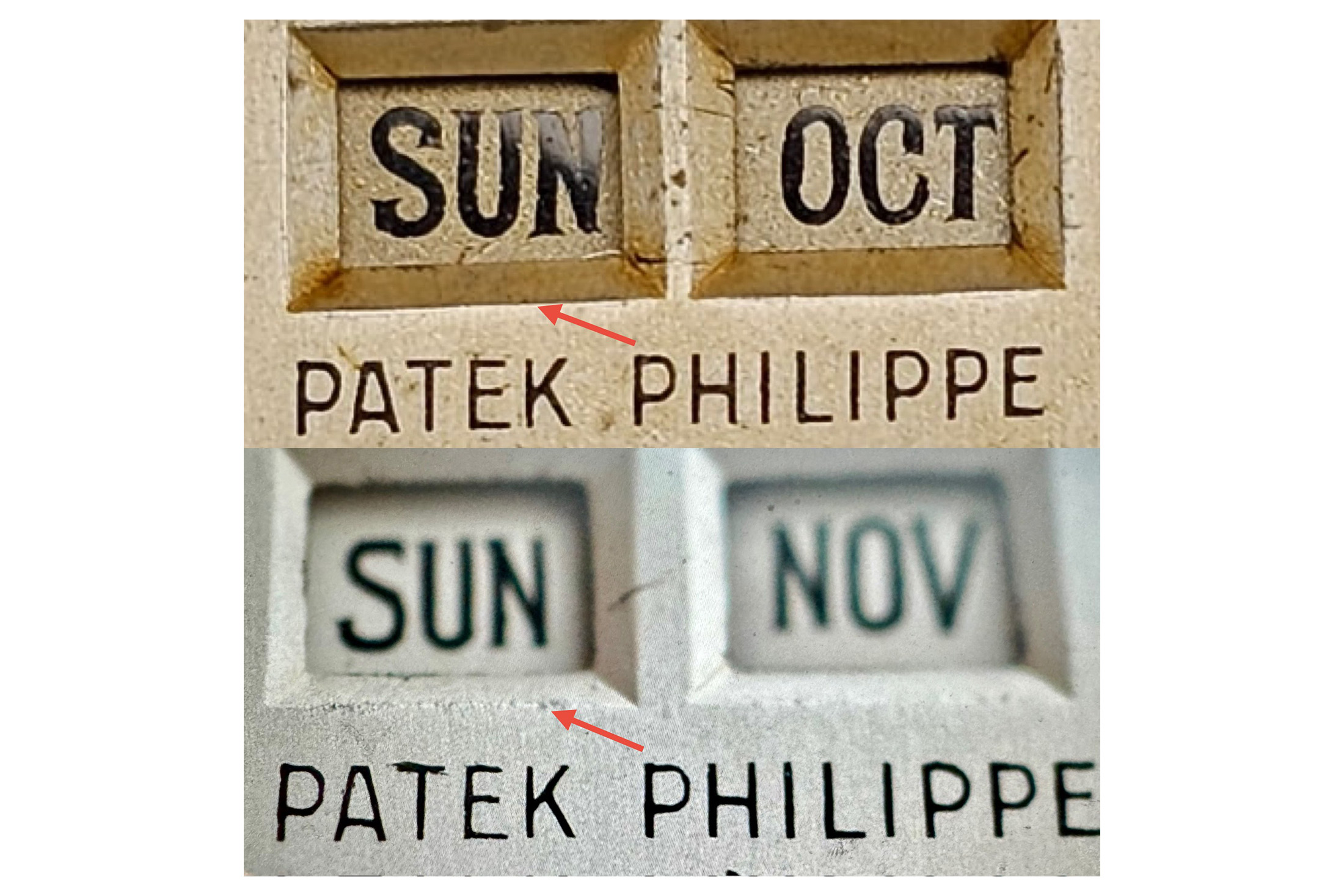 Above, a comparison of date window bevels showing original form (top) and an example showing abrasive cleaning/restoration effects (bottom). The bottom image shows a wider divider and narrower window bevels by comparison, plus additional suggestive signs of restoration work. Note the clear serif style best seen on the macro image of the month disc.