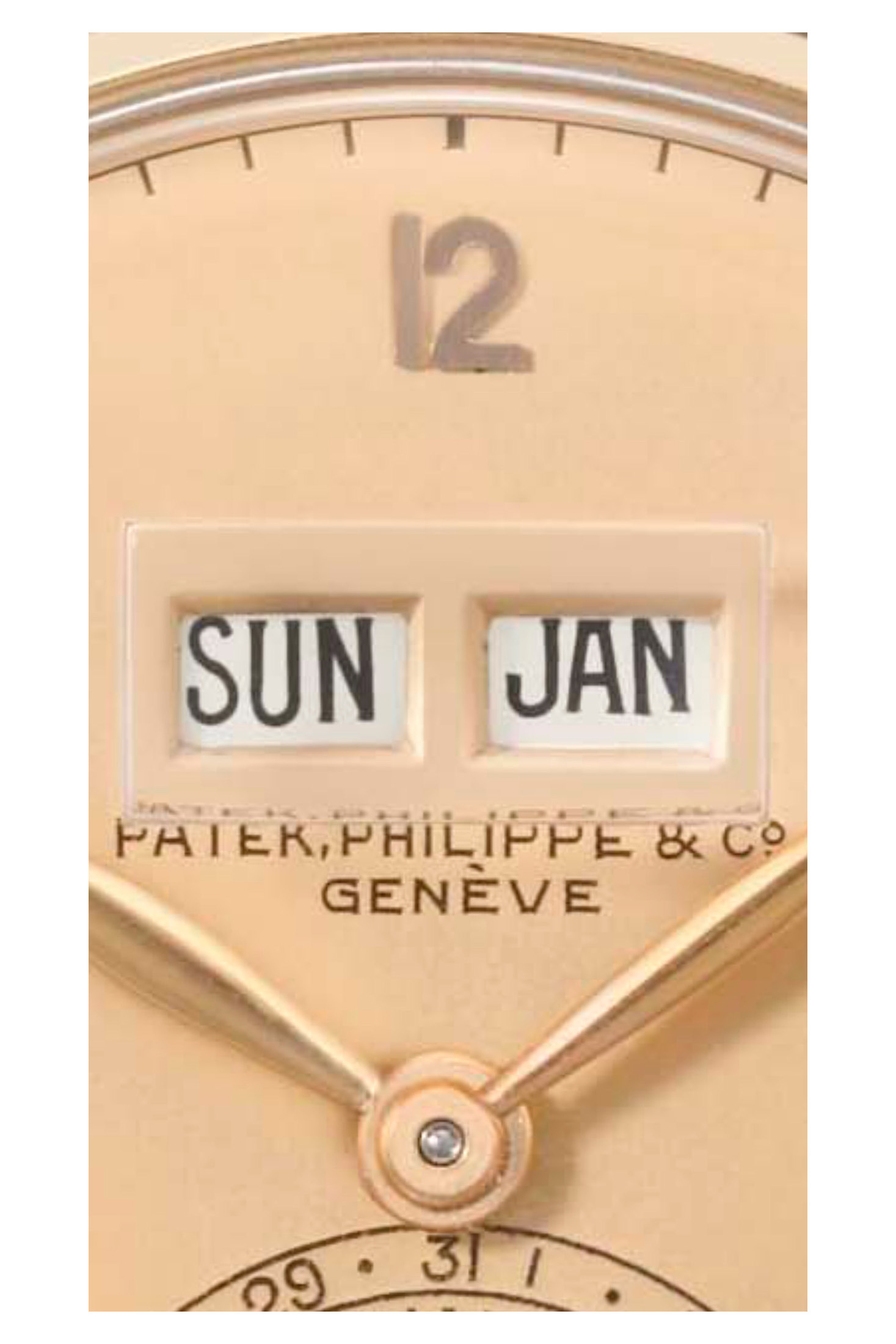 A  close up view of subject example’s date disc. Note how the hand-engraved date with serifs on the tips and the gold disc show the matte-grained finish.