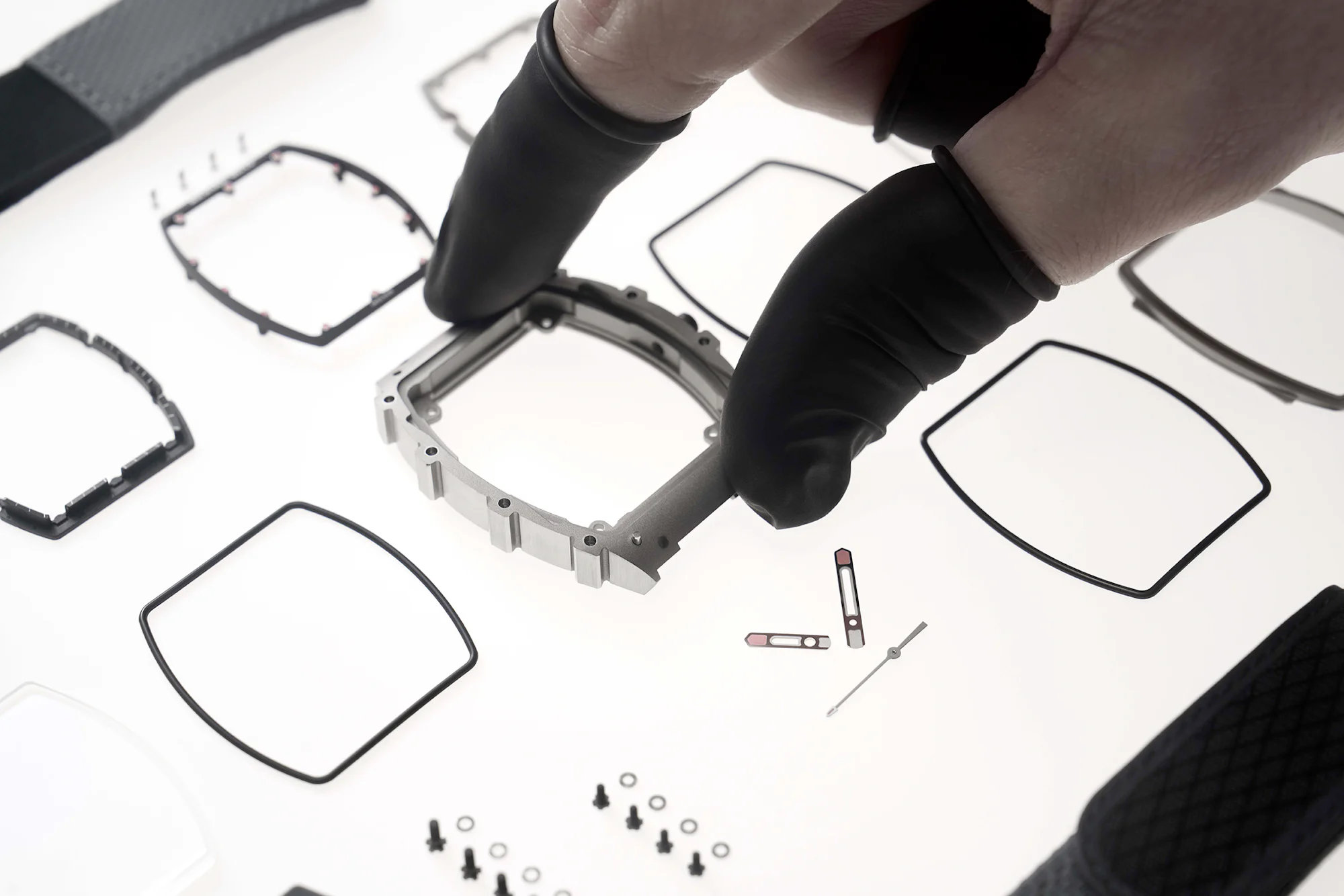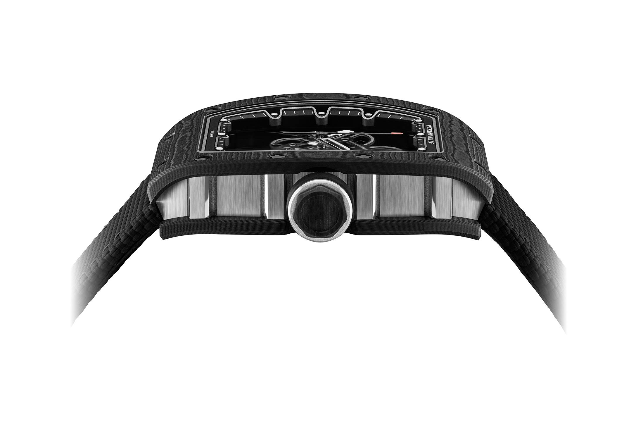 There are three cases available for the new RM 55-01, the architecture and treatment of which seem to be the other main differentiator versus the past RM 055 models. You can choose between Carbon TPT (black), White Quartz TPT, or Grey Quartz TPT. For those not familiar, TPT stands for “Thin Ply Technology,” where tiny layers of material about 30 microns thick, separated and stacked at 45-degree angles, are impregnated with resin and then put under heat and pressure for extra strength.