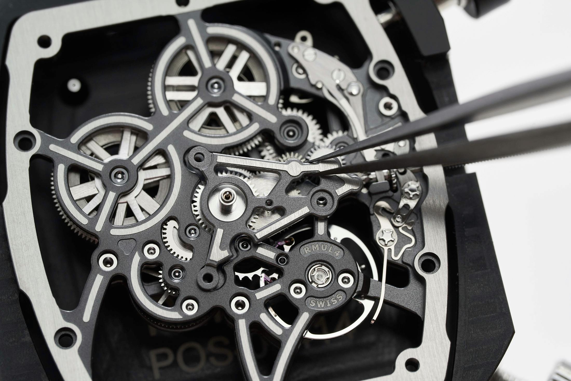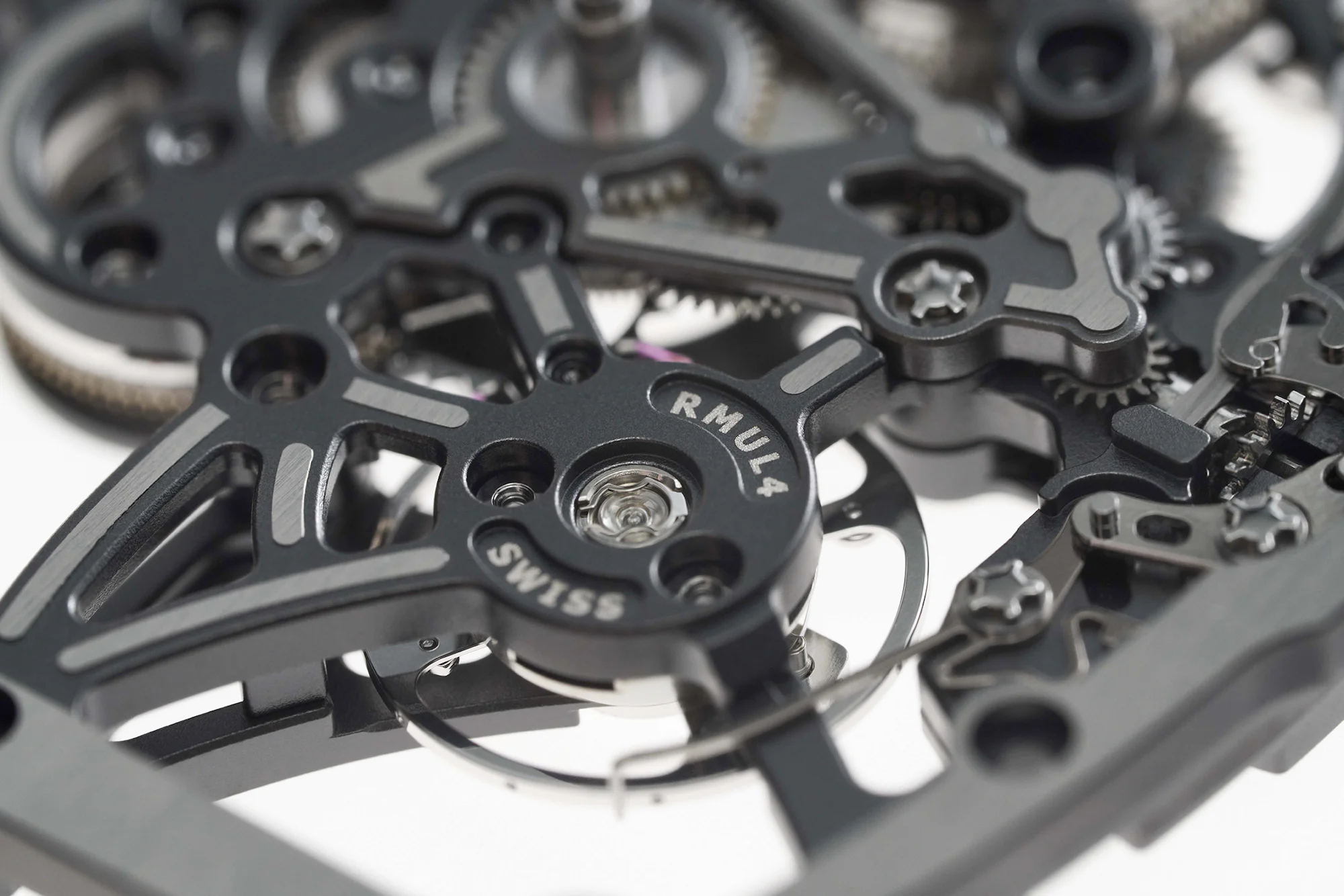 The watch may look familiar. As far as I can tell, the Caliber RMUL4 has the same geartrain as that in the RM 055 (no surprise, given the name) “Bubba Watson” model, first released over 14 years ago, in 2012. The layout of the bridges has shifted, as has a bit of the microblasted, sanded, and treated black PVD coating on the grade 5 titanium baseplate, or it is treated with Titalyt (like used on the F.P. Journe élégante). The movement has two barrels in series to provide 55 hours of power reserve and smoother, more even torque, with a 4Hz balance and variable inertia.